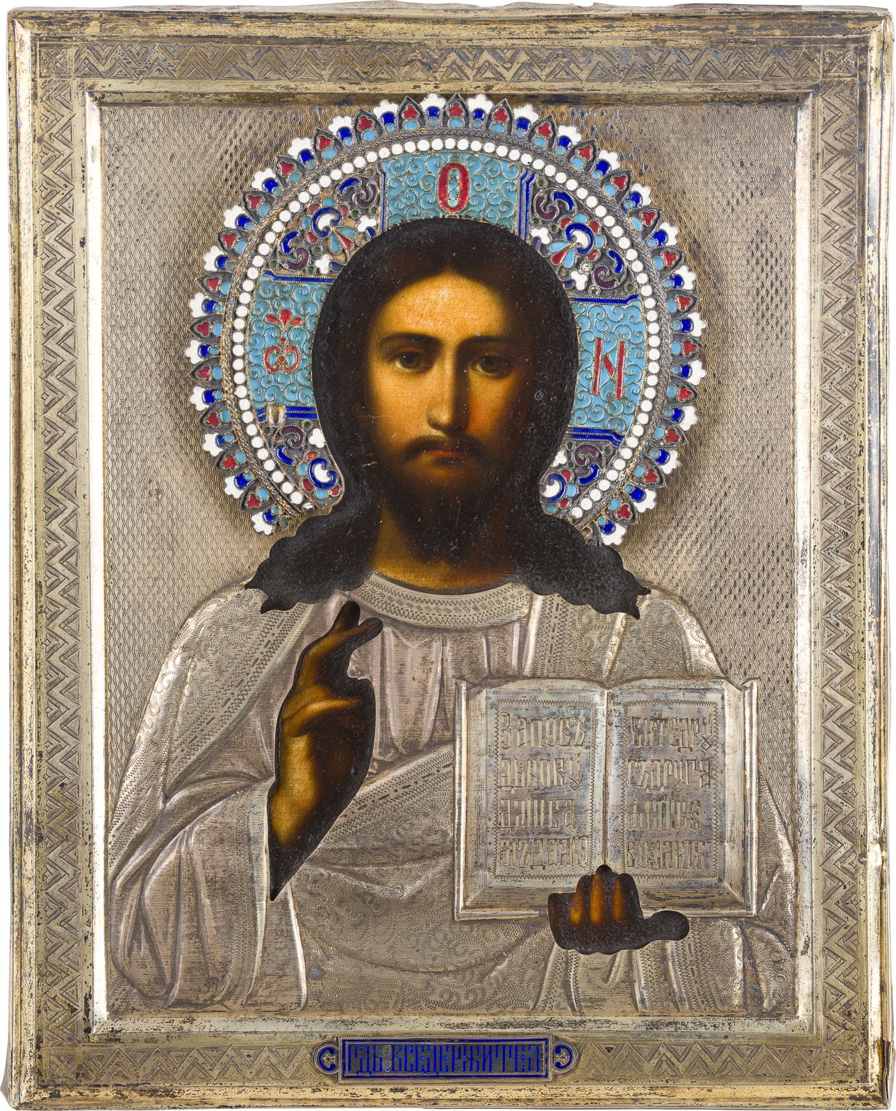 KLEINE IKONE MIT CHRISTUS PANTOKRATOR MIT CLOISONNÉ-EMAIL-OKLAD