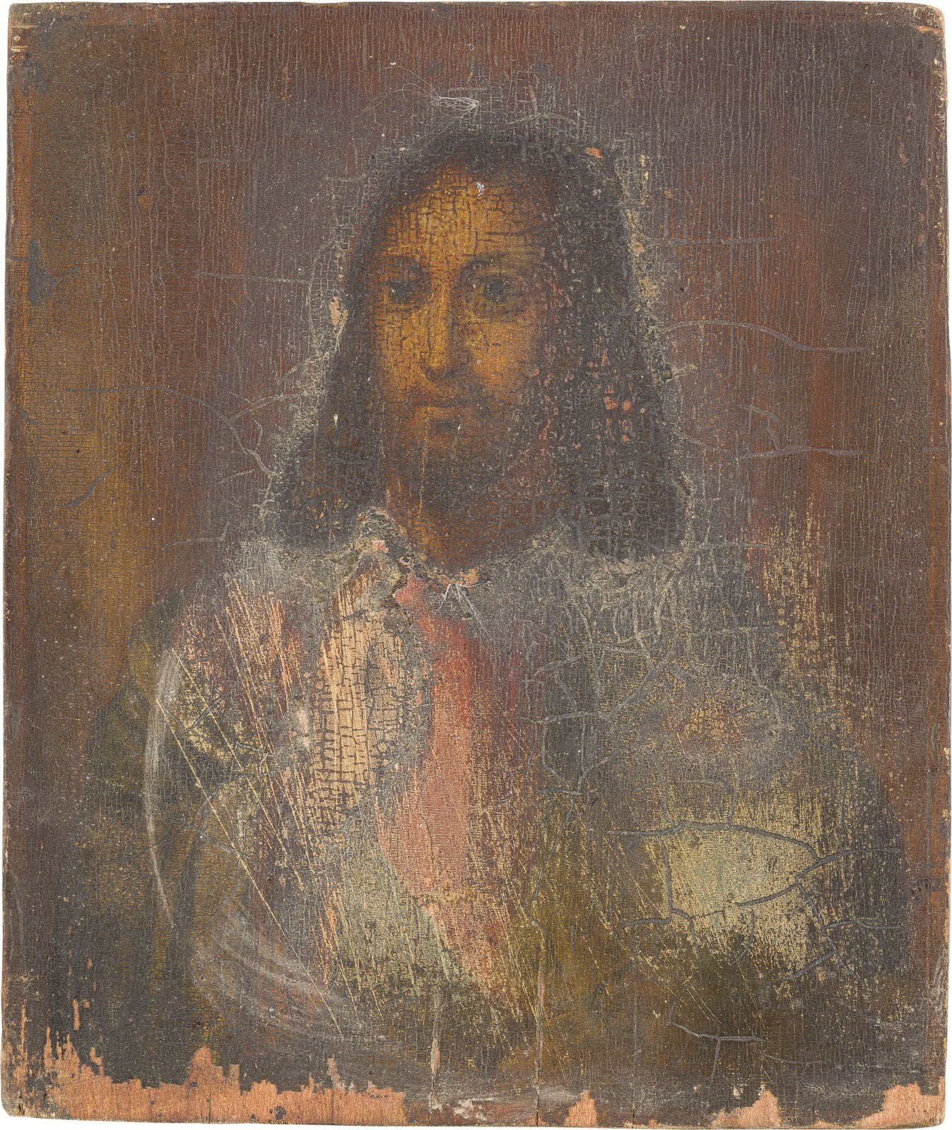Holztafel, Ölmalerei. Messingoklad mit Gravurdekor. 17,5 x 15,2 cm. Substanzverluste.