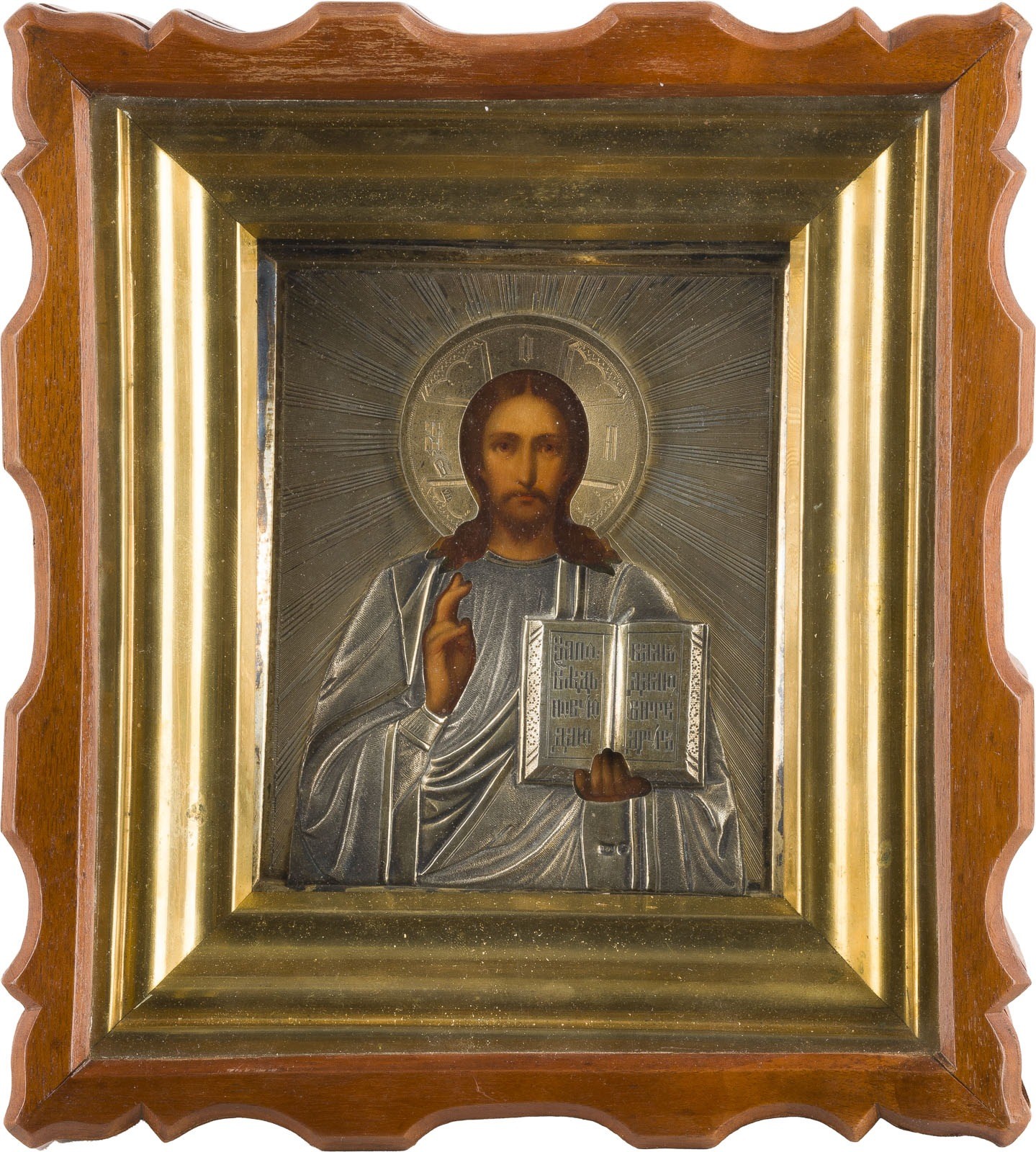 KLEINE IKONE MIT CHRISTUS PANTOKRATOR MIT VERMEIL-OKLAD IM KIOT