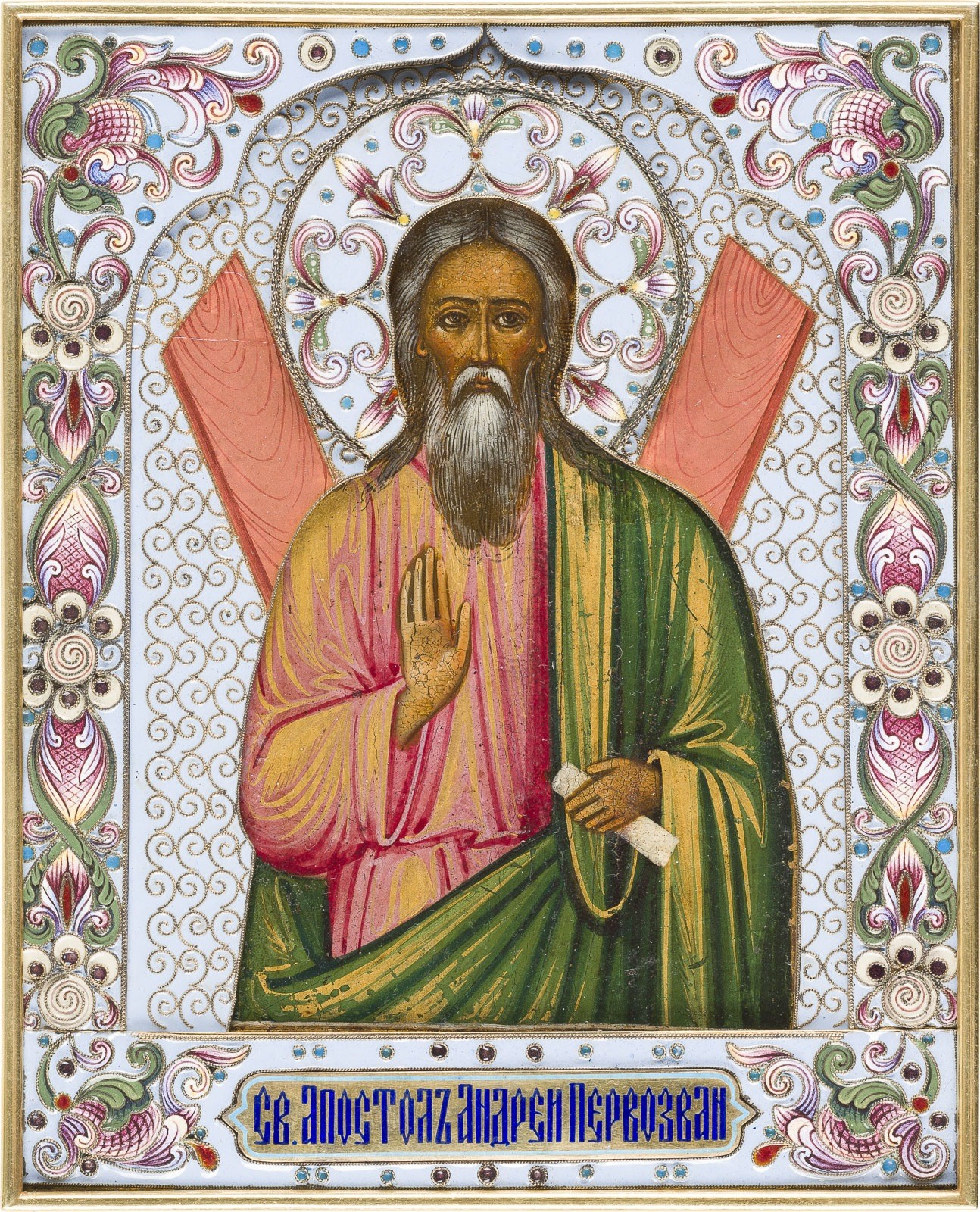 KLEINE IKONE MIT DEM APOSTEL ANDREAS MIT CLOISONNÉ-EMAIL-RIZA