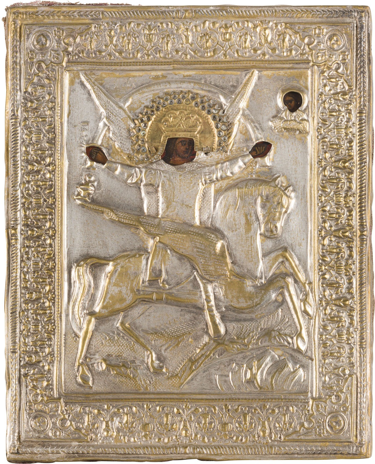 KLEINE IKONE MIT DEM ERZENGEL MICHAEL ARCHISTRATEGOS ALS APOKALYPTISCHER REITER MIT OKLAD