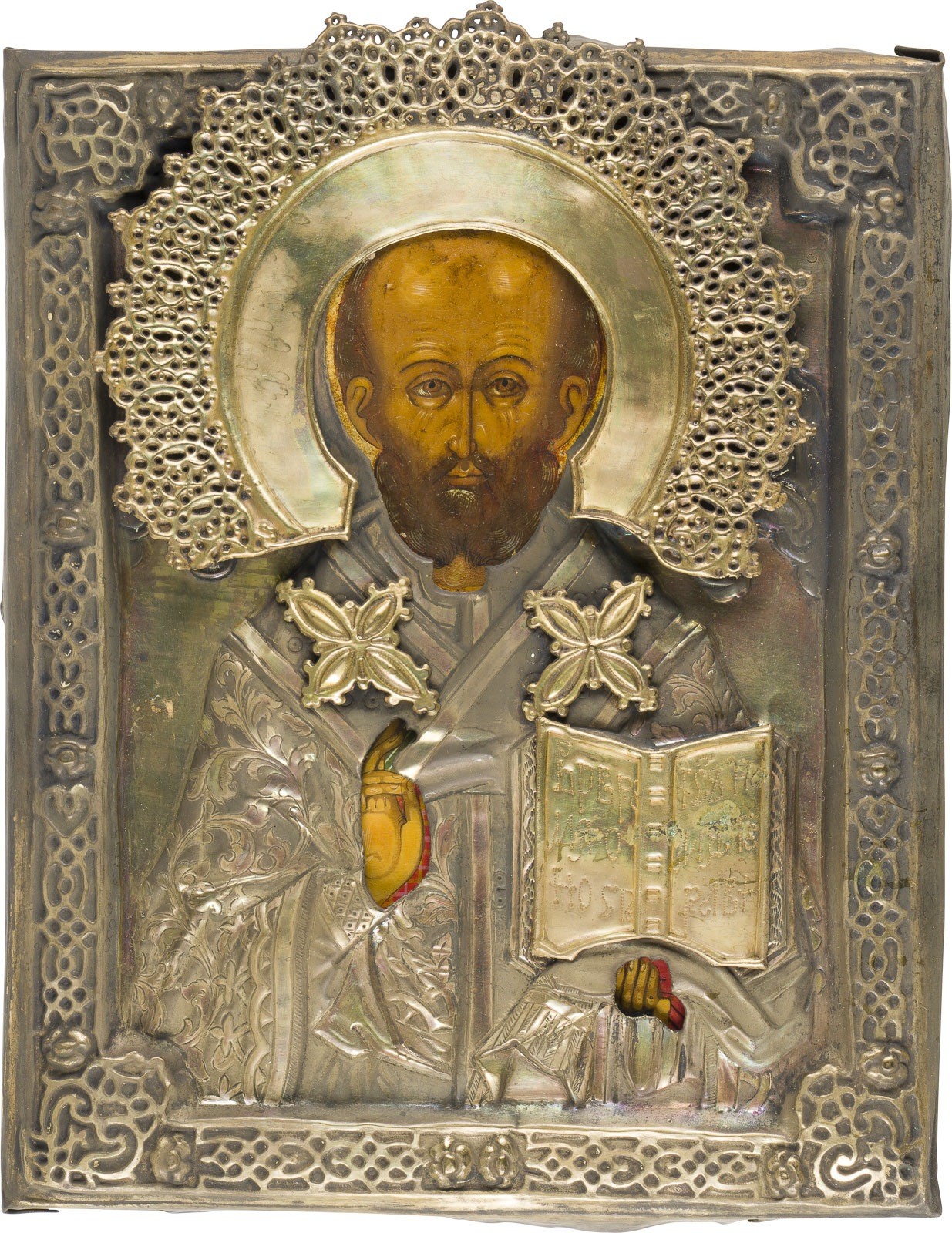KLEINE IKONE MIT DEM HEILIGEN NIKOLAUS VON MYRA MIT OKLAD