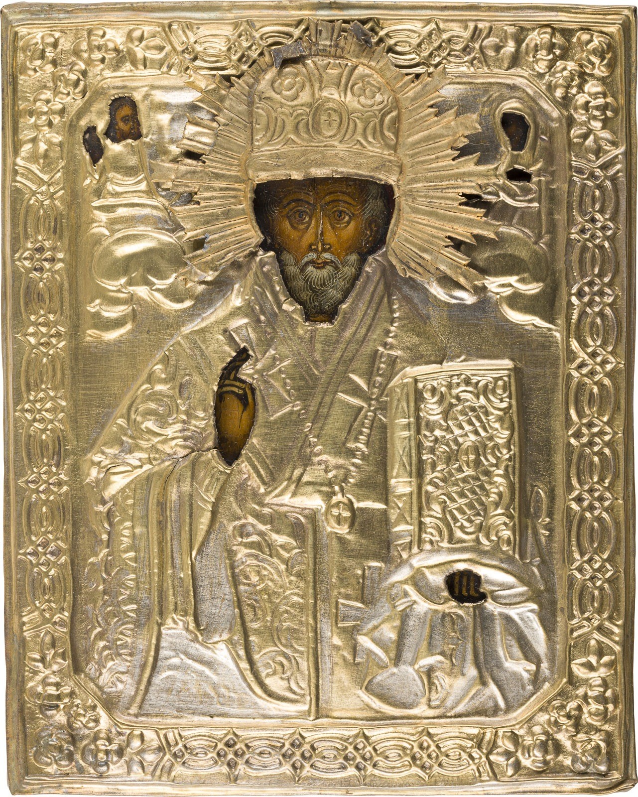 KLEINE IKONE MIT DEM HEILIGEN NIKOLAUS VON MYRA MIT OKLAD