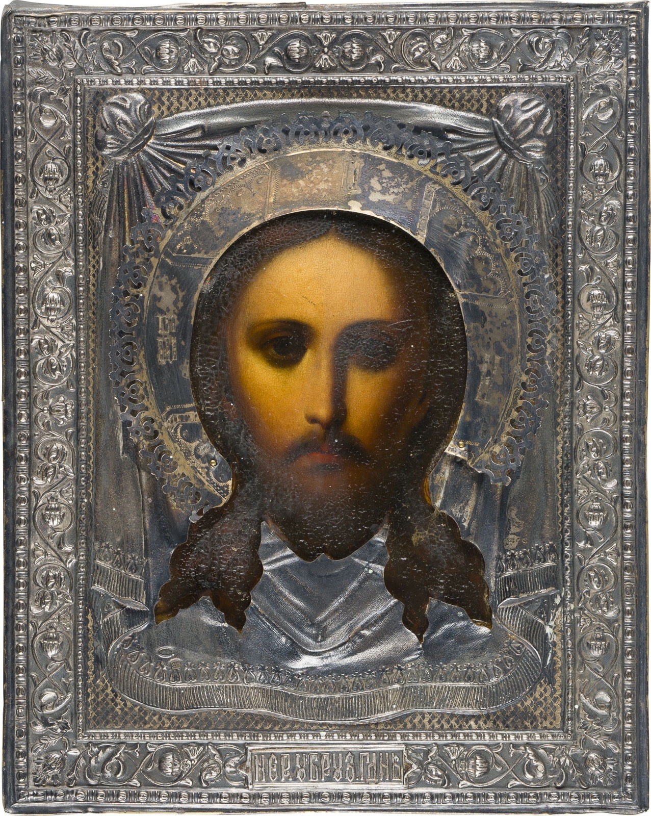 Holztafel, verso Samtabdeckung. Ölmalerei. Oklad aus Silber mit reliefiertem Rankendekor. 22 x 17,6 cm. Punziert mit Marke der Bezirksbeschauadministration mit Feingehalt '84' und Meistermarke 'SG' in Kyrillisch.