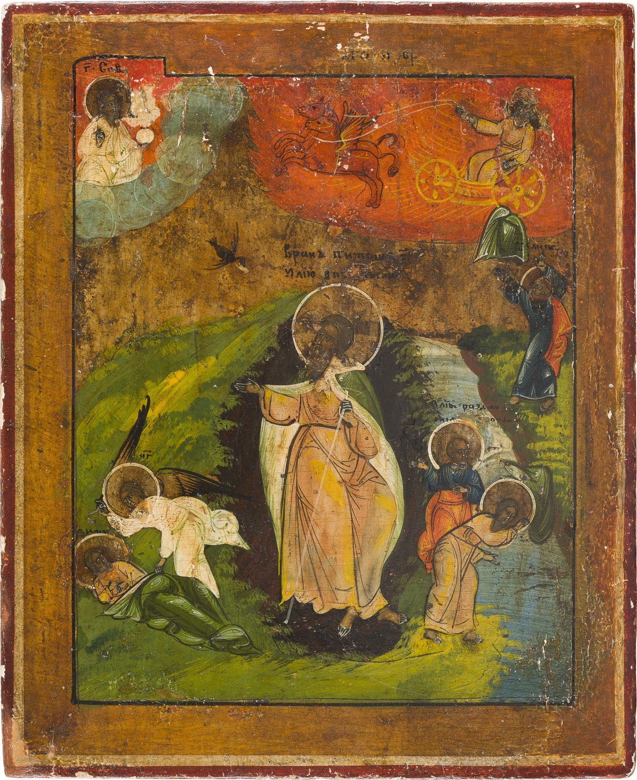 KLEINE IKONE MIT DEM PROPHETEN ELIAS, SEINEM LEBEN IN DER WÜSTE UND SEINER FEURIGEN HIMMELFAHRT
