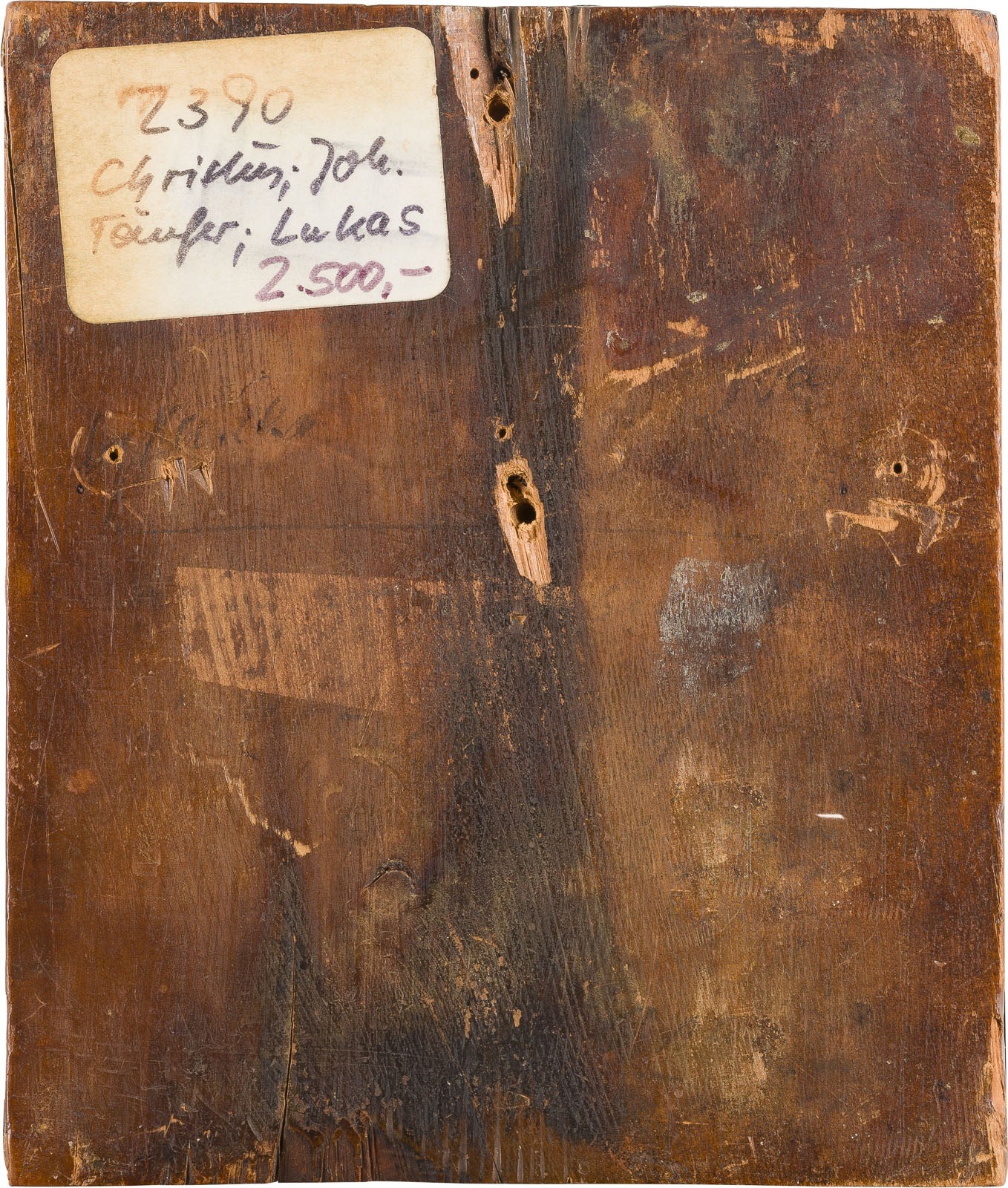 Einzeltafel. Eitempera auf Kreidegrund, partielle Vergoldung. Riza aus vergoldetem Silber mit Palmettbordüre. 14,5 x 12,3 cm. Punziert mit Stadtmarke, Beschaumeisterzeichen, Feingehalt '84' und Meistermarke 'PS' in Kyrillisch. Min. Farbverluste, min. rest.