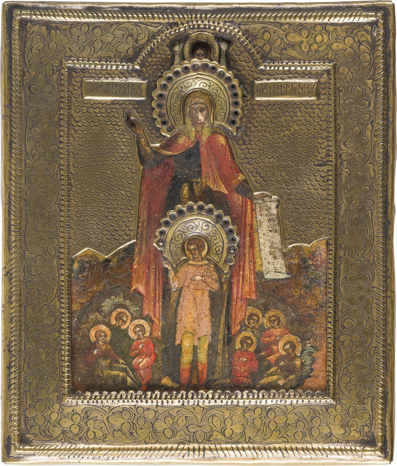 KLEINE IKONE MIT DEN HEILIGEN JULITTA UND KIRIK SOWIE DEN SIEBEN SCHLÄFERN VON EPHESOS MIT RIZA