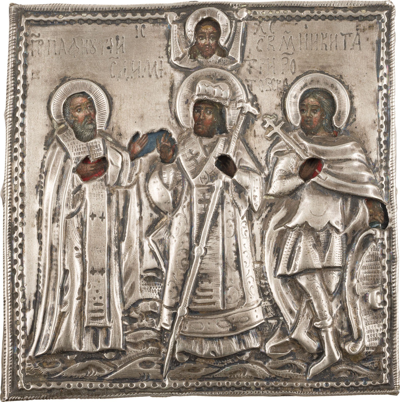 KLEINE IKONE MIT DEN HEILIGEN PAFNUTIJ, DMITRIJ VON ROSTOW UND NIKITA MIT SILBER-OKLAD