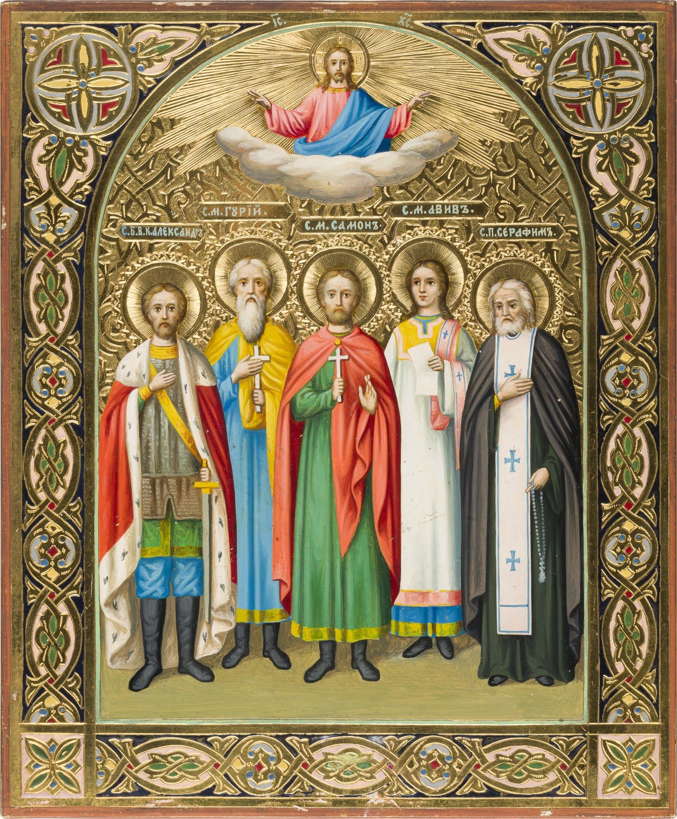 KLEINE IKONE MIT DEN HEILIGEN SAMON, GURIJ, AVIV, ALEXANDER NEWSKI UND SERAFIM VON SAROW