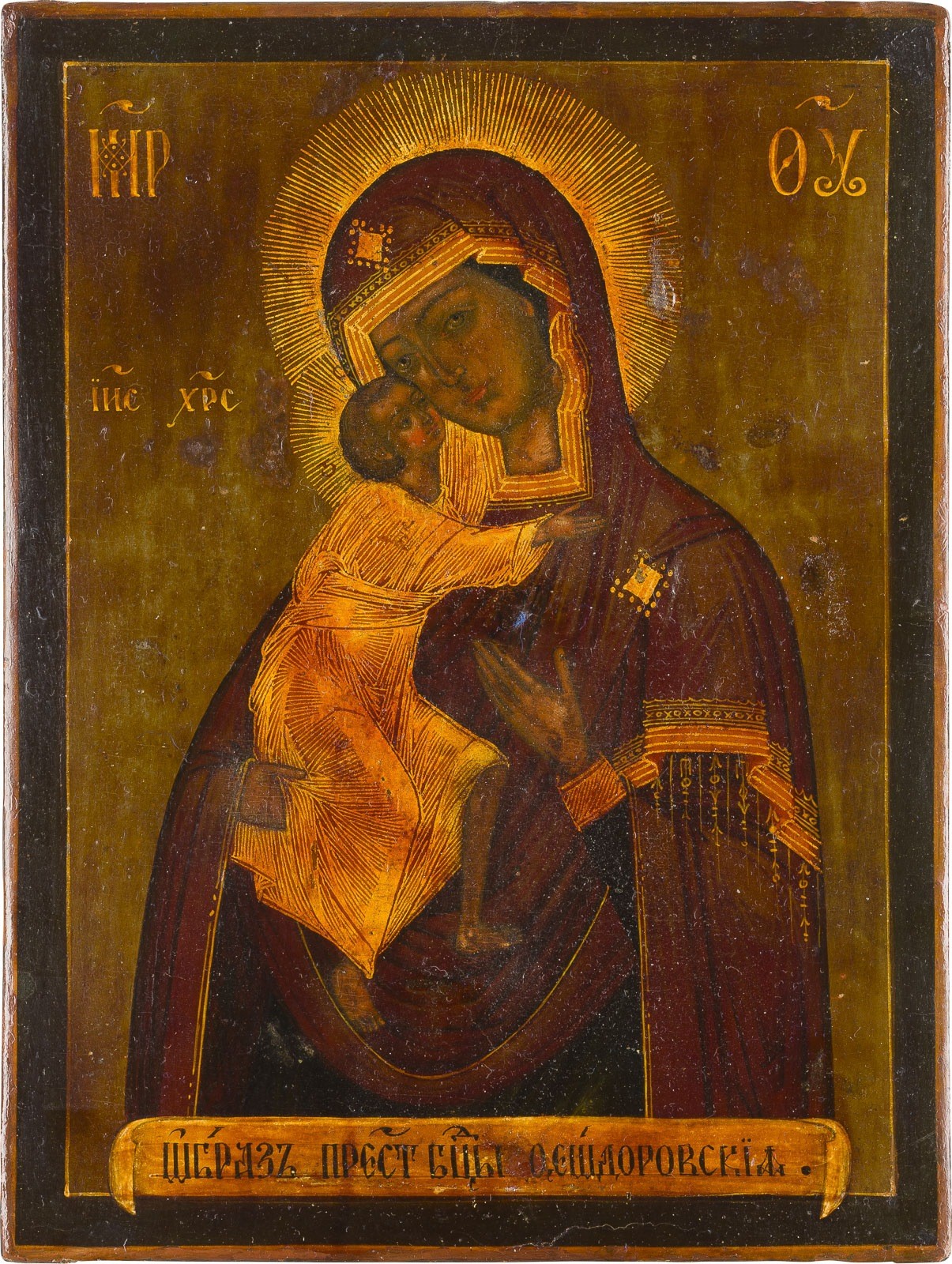 Einzeltafel mit einer Rückseiten-Querleiste (verloren). Eitempera auf Kreidegrund, partielle Vergoldung. Oklad aus fein getriebenem, vergoldetem Silber. 20,3 x 15,5 cm. Punziert mit Stadtmarke, Beschaumeisterzeichen, Feingehalt '84' und Meistermarke 'PB' in Kyrillisch. Punktuelle Einstimmungen.