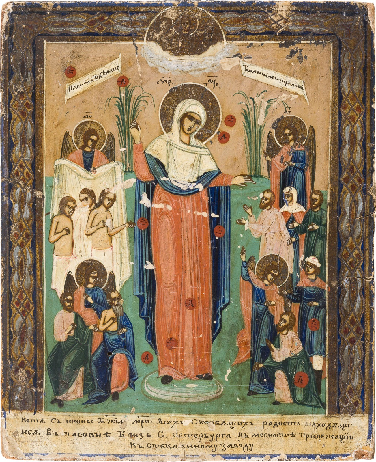 KLEINE IKONE MIT DER GOTTESMUTTER 'FREUDE ALLER LEIDENDEN' MIT DEN MÜNZEN