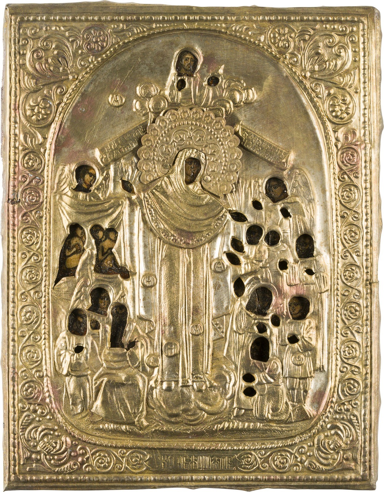 KLEINE IKONE MIT DER GOTTESMUTTER 'FREUDE ALLER LEIDENDEN' MIT DEN MÜNZEN MIT OKLAD