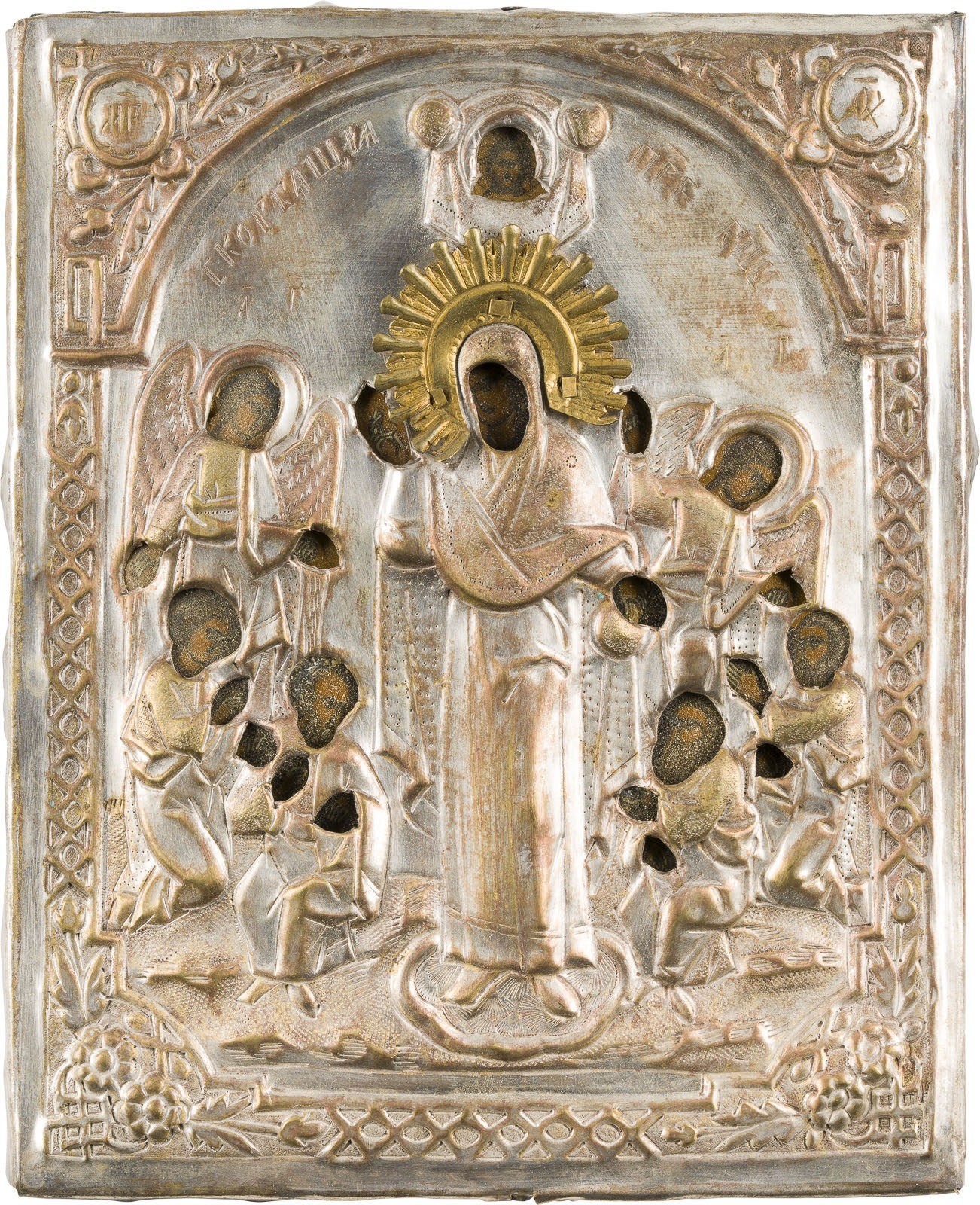 KLEINE IKONE MIT DER GOTTESMUTTER 'FREUDE ALLER LEIDENDEN' MIT OKLAD