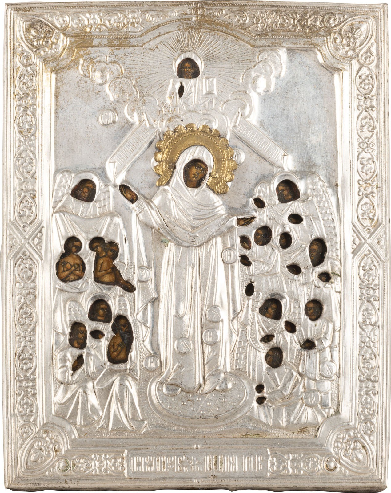 KLEINE IKONE MIT DER GOTTESMUTTER 'FREUE ALLER LEIDENDEN' MIT DEN MÜNZEN MIT OKLAD