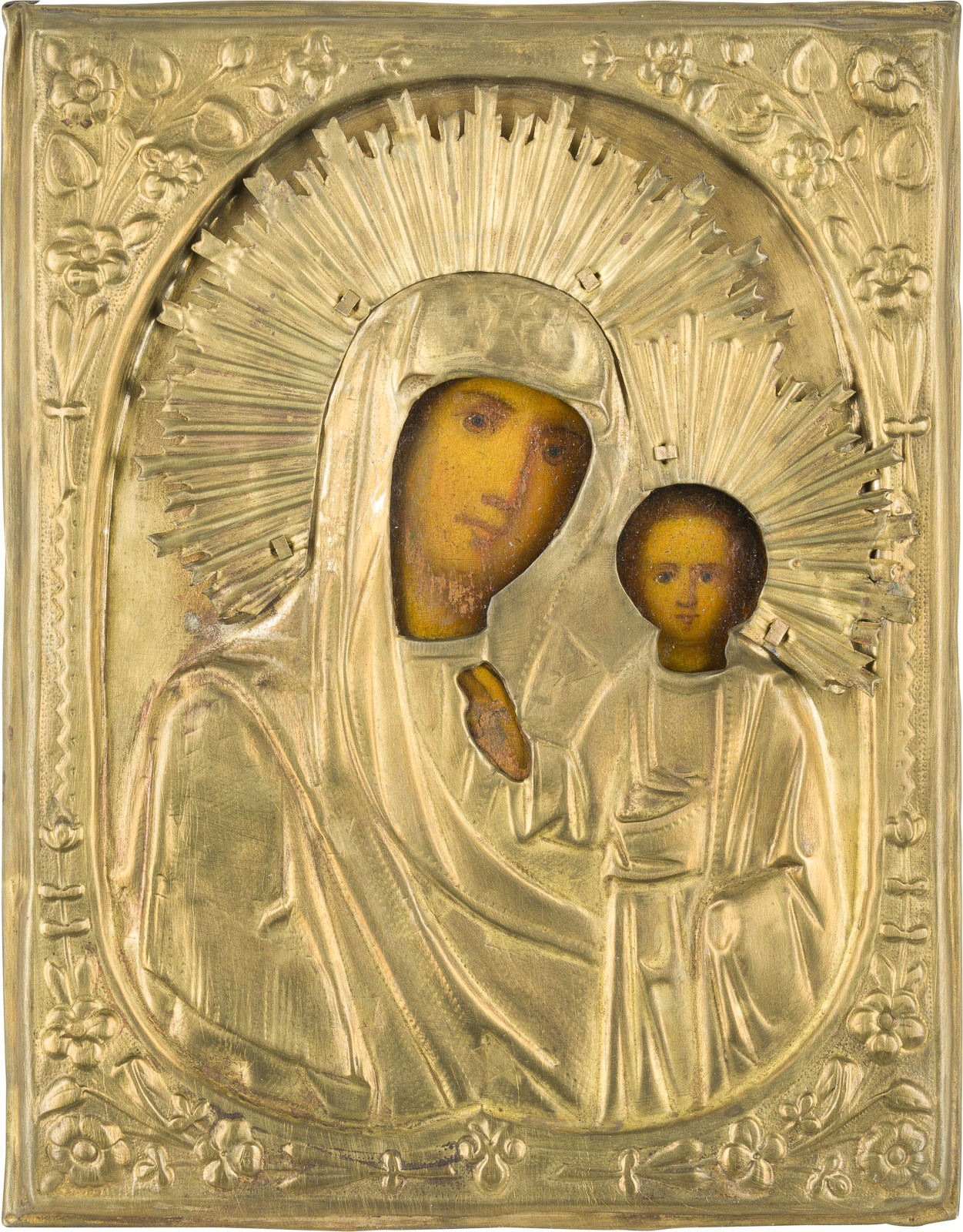 KLEINE IKONE MIT DER GOTTESMUTTER VON KASAN (KASANSKAJA) MIT OKLAD