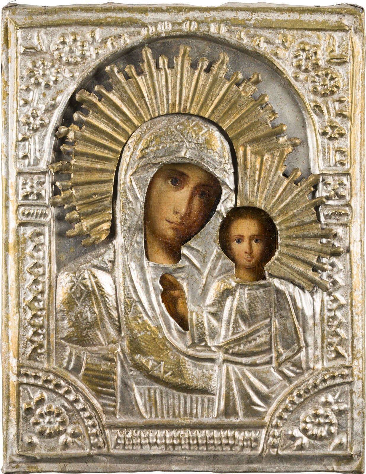 KLEINE IKONE MIT DER GOTTESMUTTER VON KASAN (KASANSKAJA) MIT OKLAD