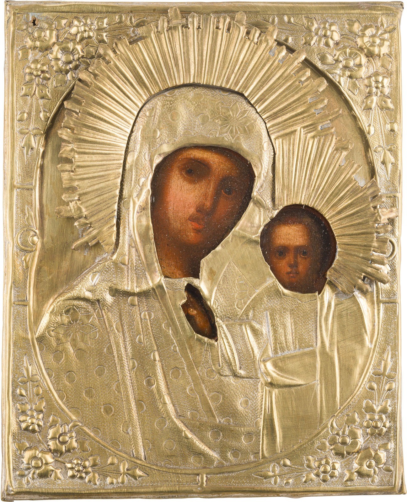 Holztafel, Ölmalerei. Messingoklad mit Reliefdekor. 22 x 17,6 cm. Nimbus min. besch.