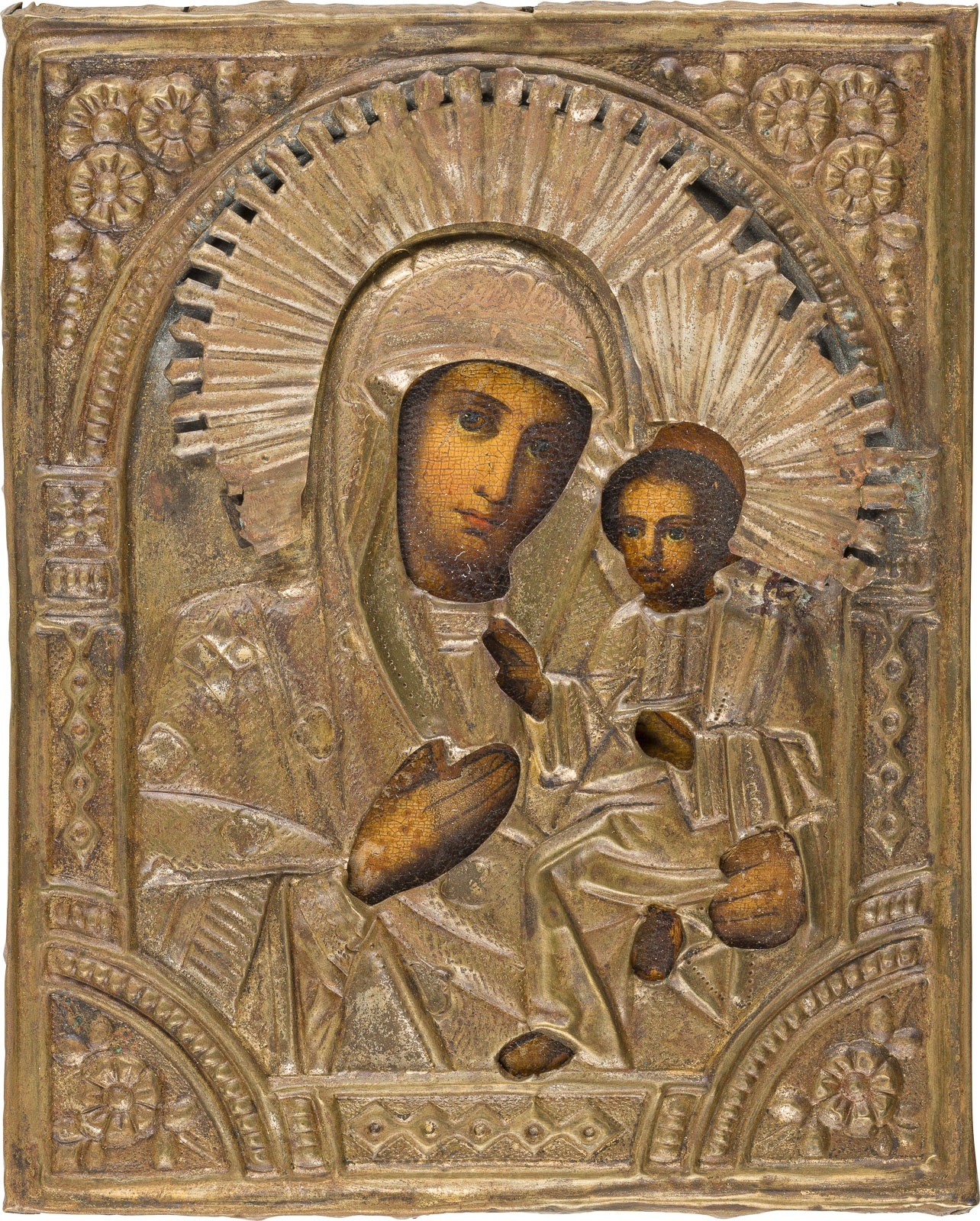 KLEINE IKONE MIT DER GOTTESMUTTER VON TICHWIN (TICHWINSKAJA) MIT OKLAD