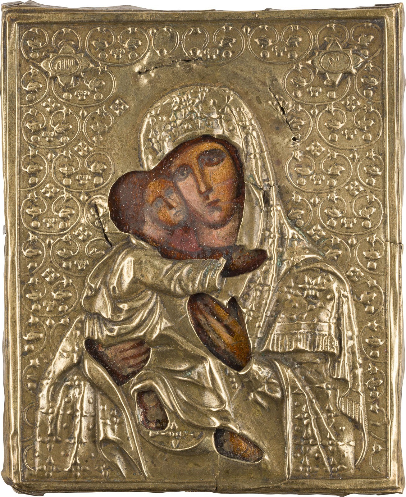 Holztafel. Ölmalerei. Messingoklad mit getriebenem Rankendekor. 13,2 x 10,9 cm. Rest.