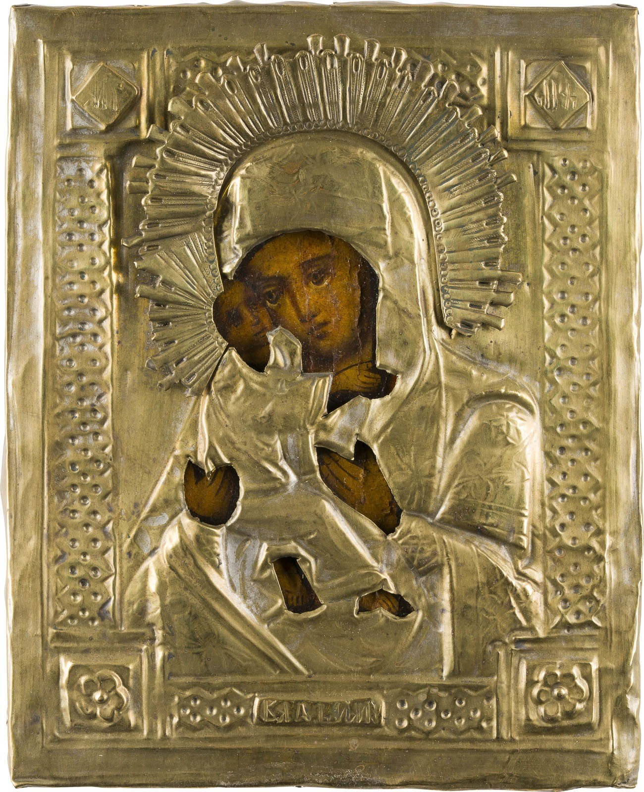 Holztafel, verso Samtabdeckung. Ölmalerei. Messingoklad mit Reliefdekor. 22 x 17,7 cm. Partiell rest.