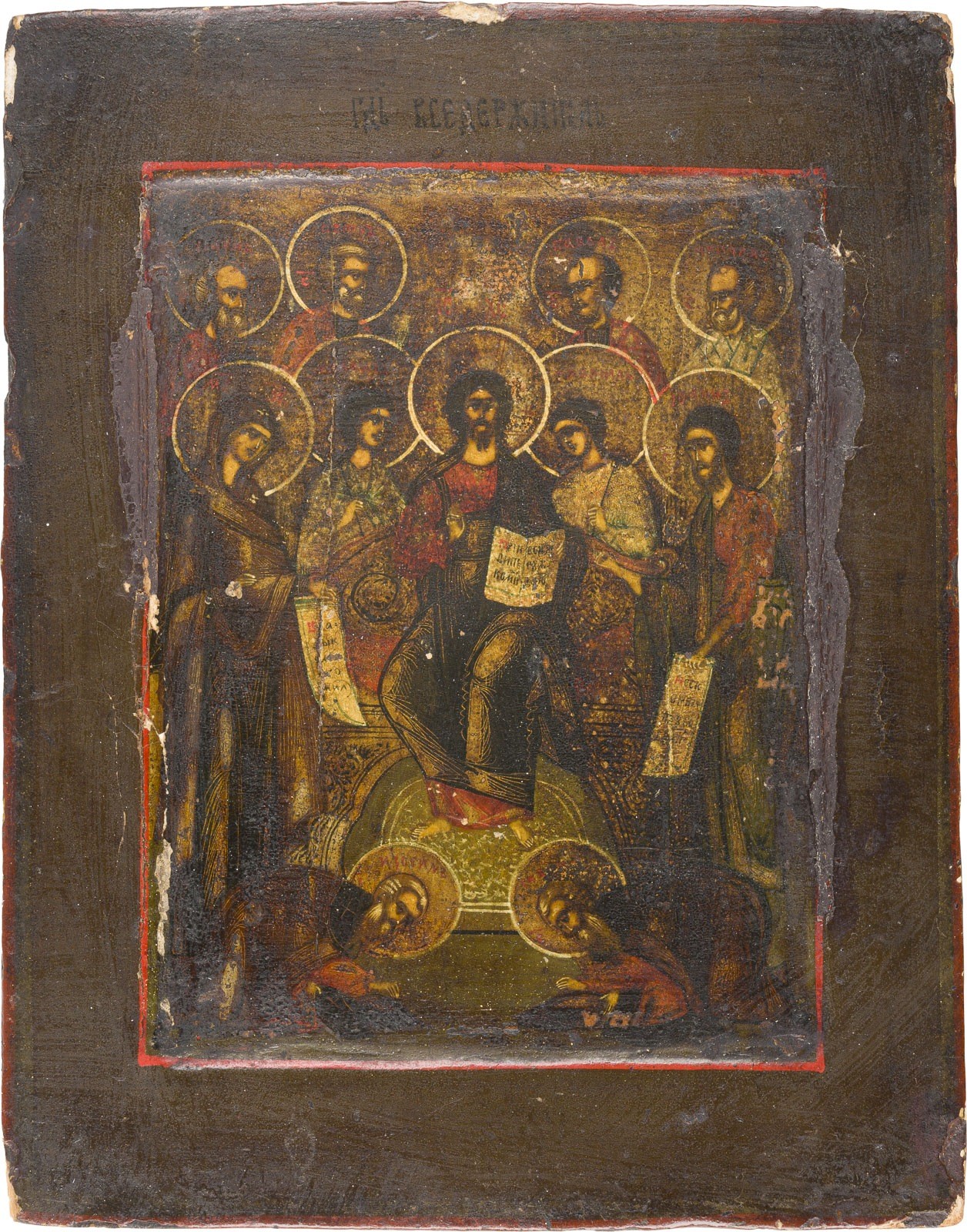 Verbund zweier Bretter mit einer Rückseiten-Querleiste. Kowtscheg, Eitempera auf Kreidegrund, versilberte Nimben goldfarben lasiert. 22,2 x 17,6 cm. Substanzverluste im Randbereich.