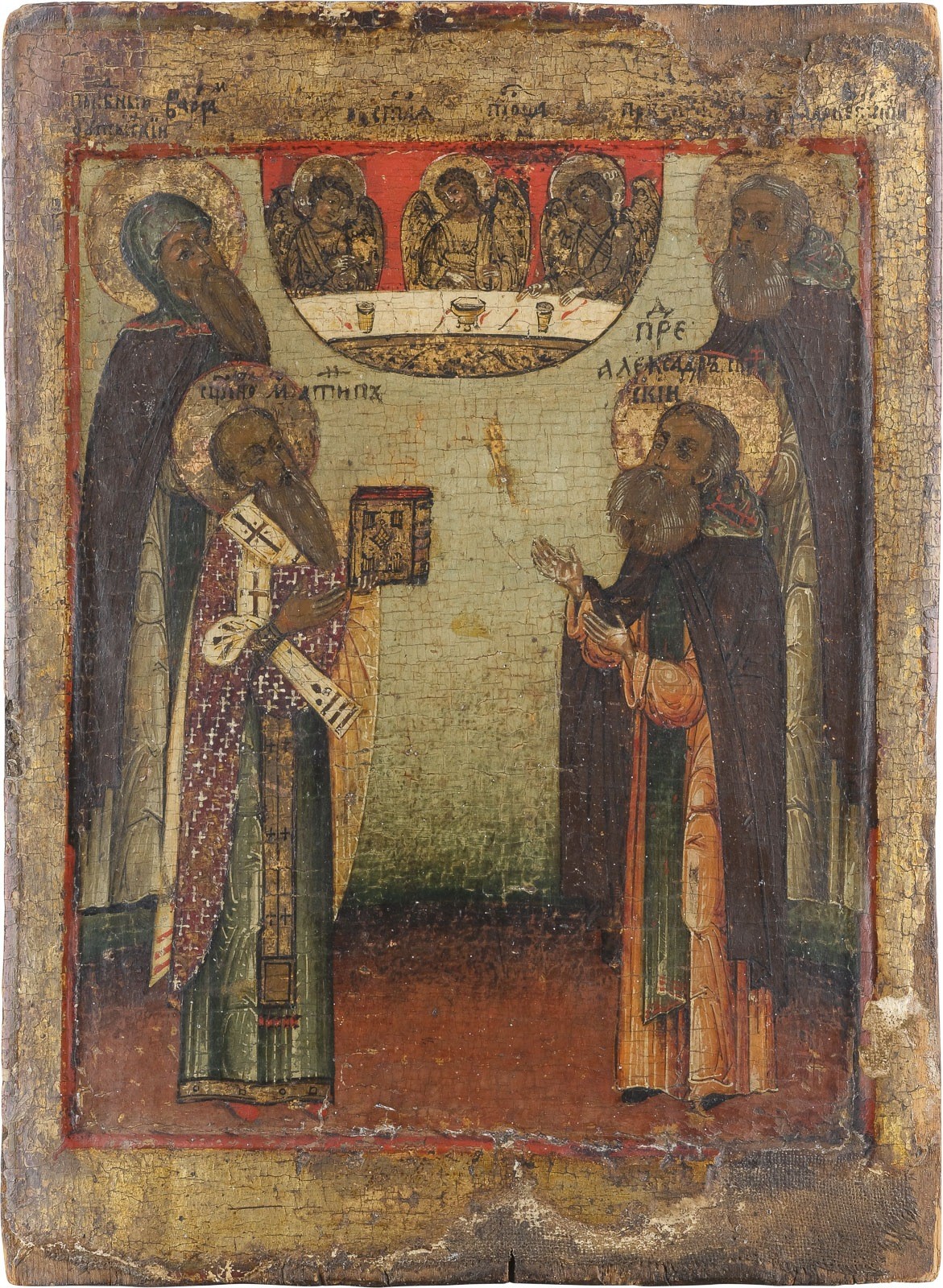KLEINE PATRONATSIKONE MIT DER HEILIGEN DREIFALTIGKEIT, DREI MÖNCHEN UND EINEM BISCHOFSHEILIGEN