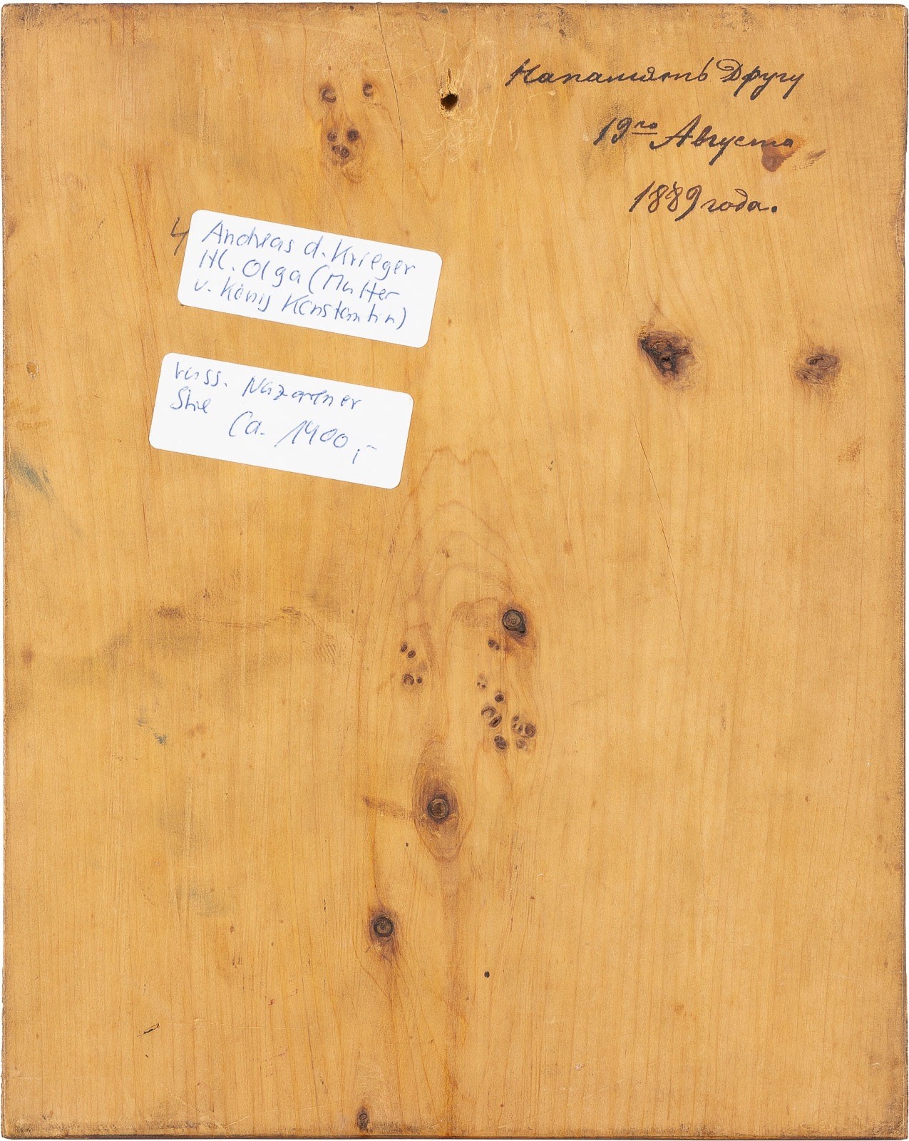 Laubholz-Einzeltafel. Ölmalerei. 22 x 17,5 cm. Kyrillisch signiert und datiert unten rechts, verso kyrillische Widmung mit Datierung '1889'.