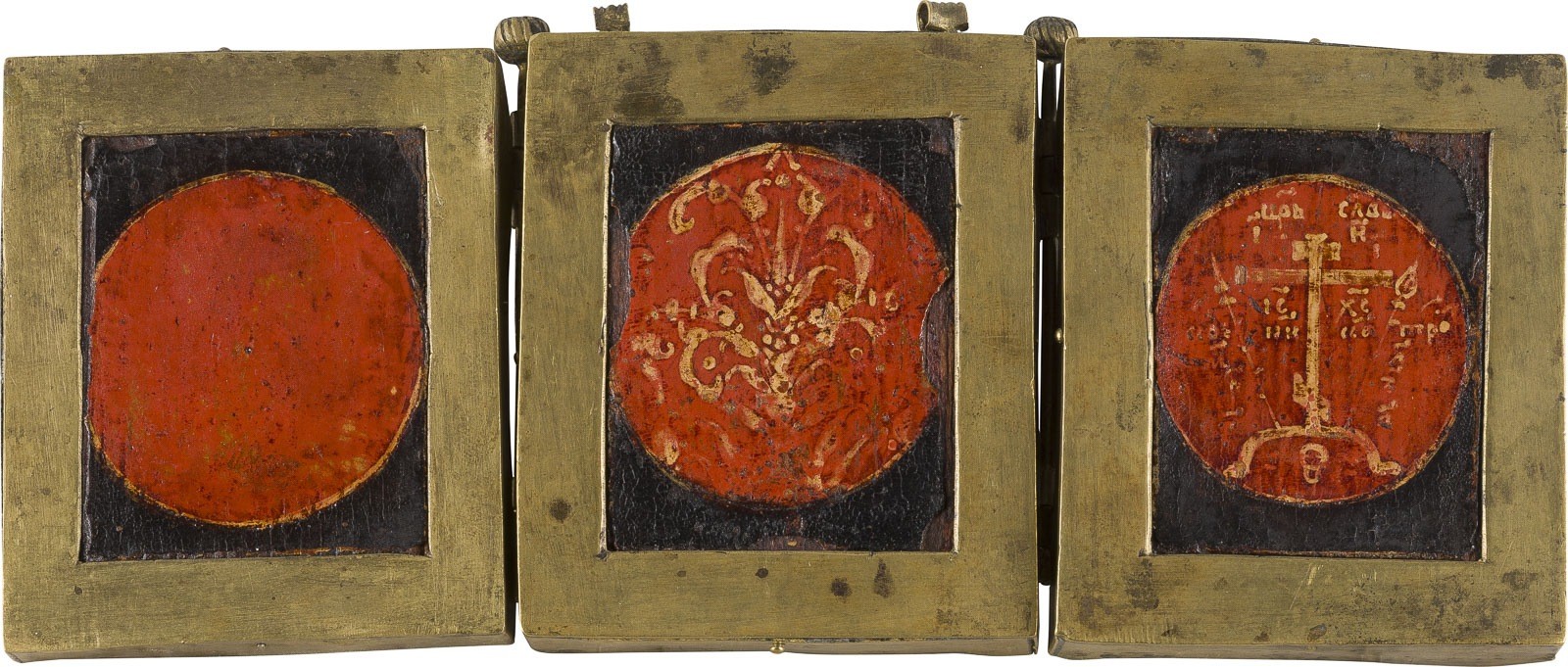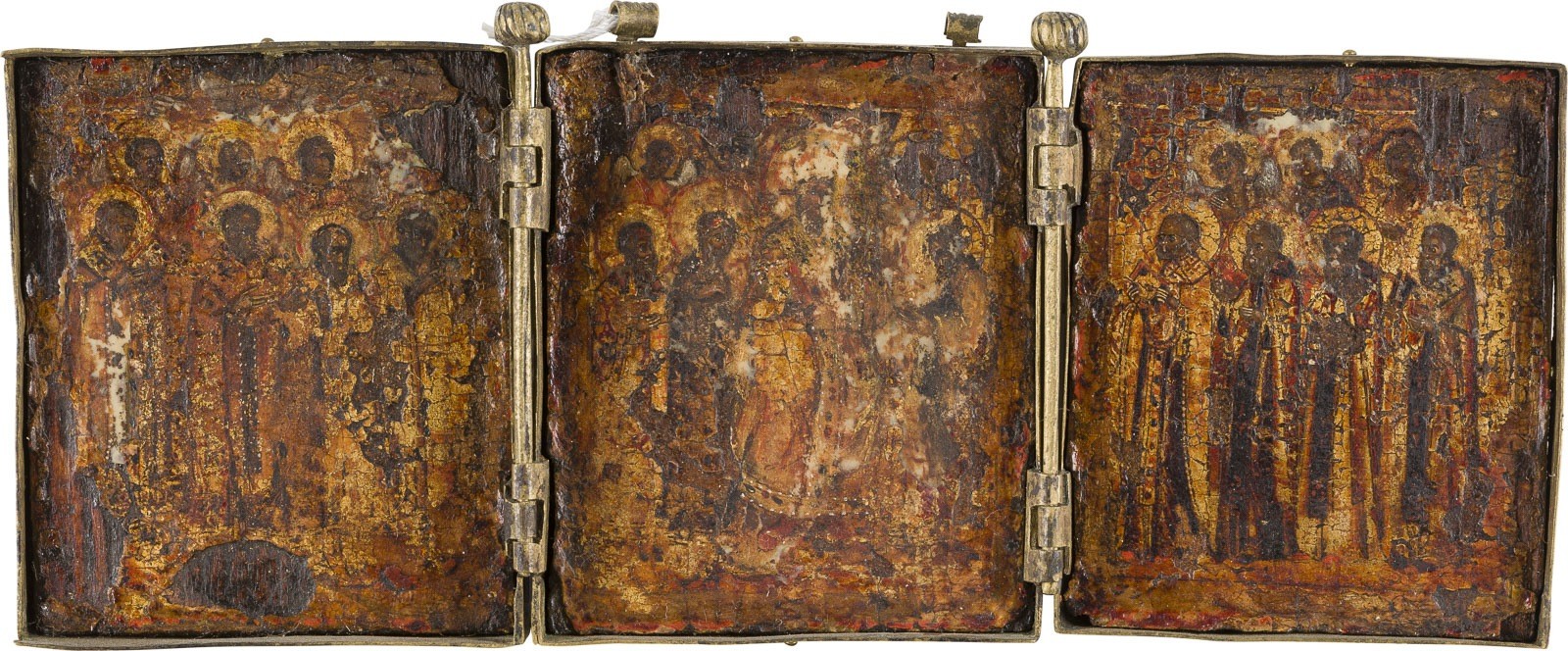 Holztafeln, Eitempera auf Kreidegrund, Vergoldung, Metallmontierung. 17,8 x 20,2 cm (geöffnet). Substanzverluste, rest.