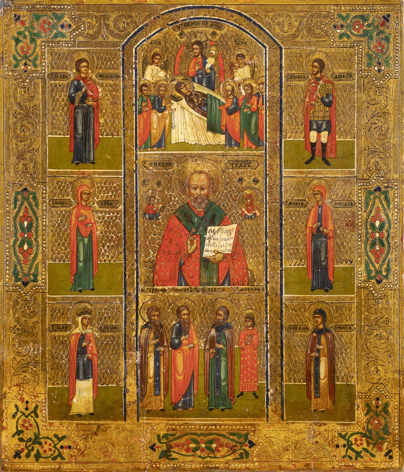 MEHRFELDER-IKONE MIT DEM ENTSCHLAFEN DER GOTTESMUTTER UND AUSGEWÄHLTEN HEILIGEN