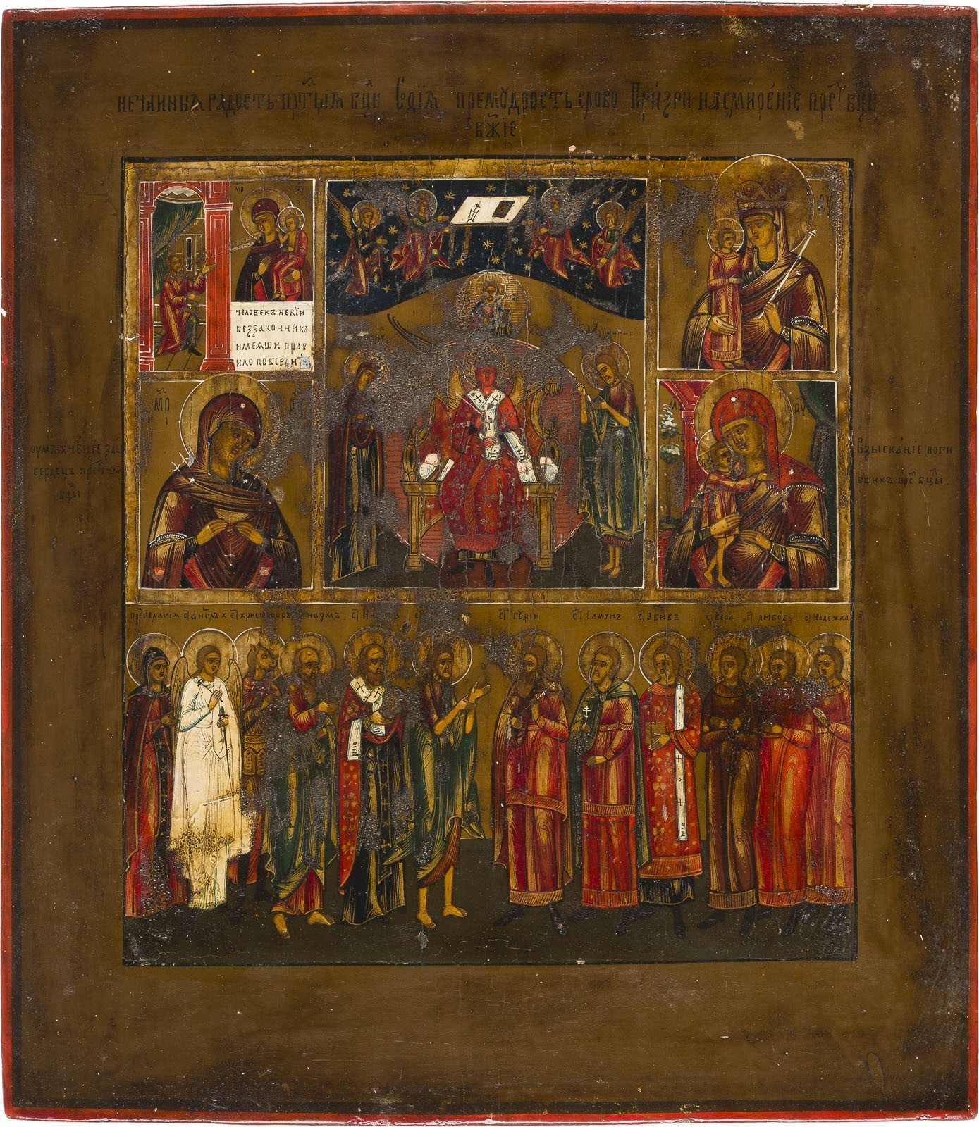 MEHRFELDER-IKONE MIT SOPHIA, DER GÖTTLICHEN WEISHEIT, GNADENBILDERN DER GOTTESMUTTER UND AUSGEWÄHLTEN HEILIGEN
