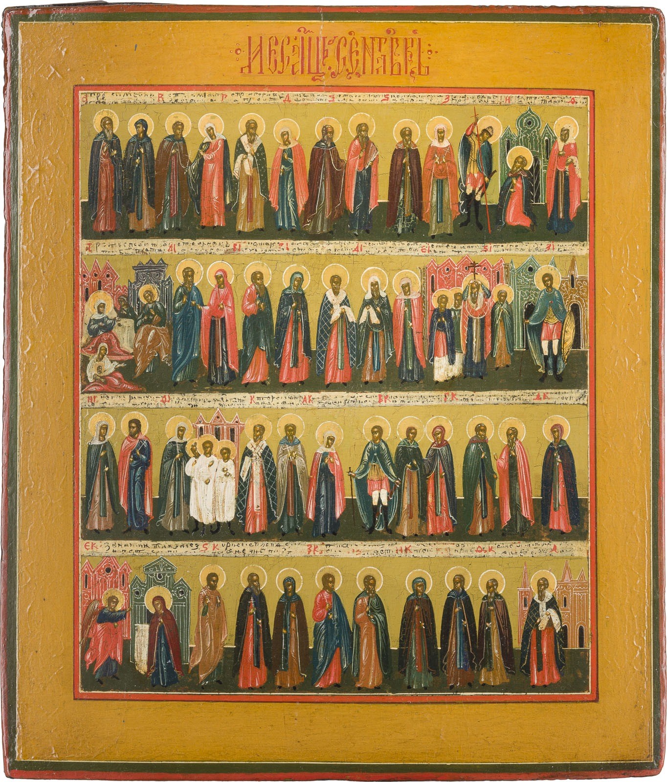 Verbund dreier Bretter mit zwei Stirnseiten-Sponki. Eitempera auf Kreidegrund, Nimben vergoldet. 35 x 30,5 cm. Restaurierungen.