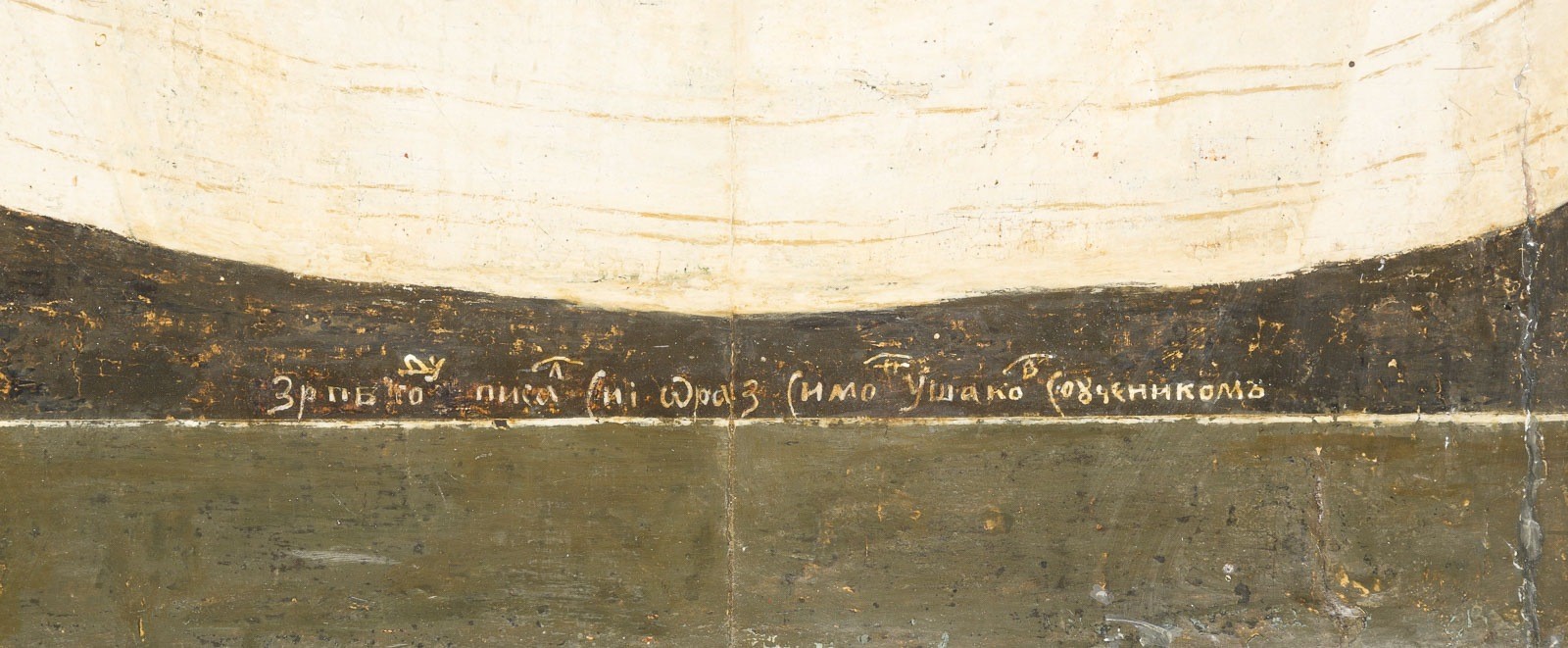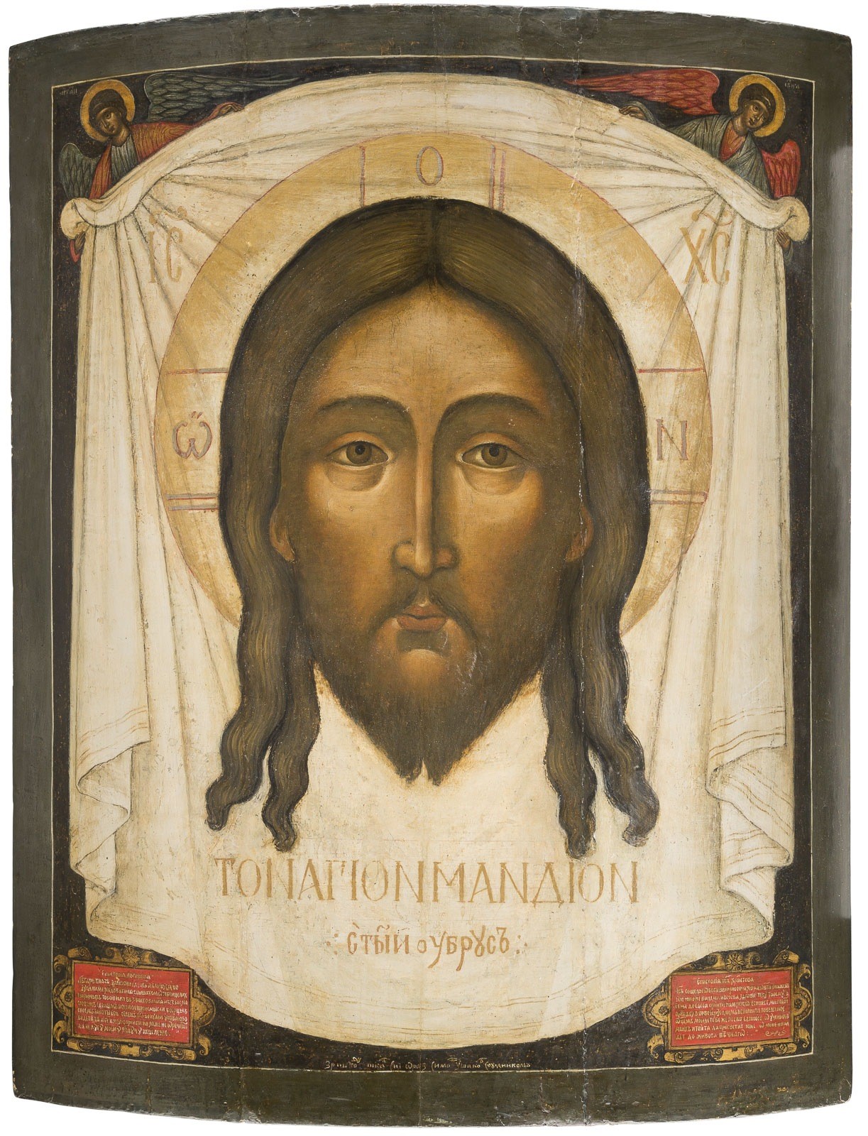 Verbund dreier Bretter mit zwei Rückseiten-Sponki (verloren, erg.). Eitempera auf Kreidegrund, partielle Vergoldung. 102,3 x 85 cm. Am unteren Rand kyrillisch bezeichnet 'Simon Uschakow'. Das Mandylion von Simon Uschakow (1658) ist ein bedeutendes Werk der russischen