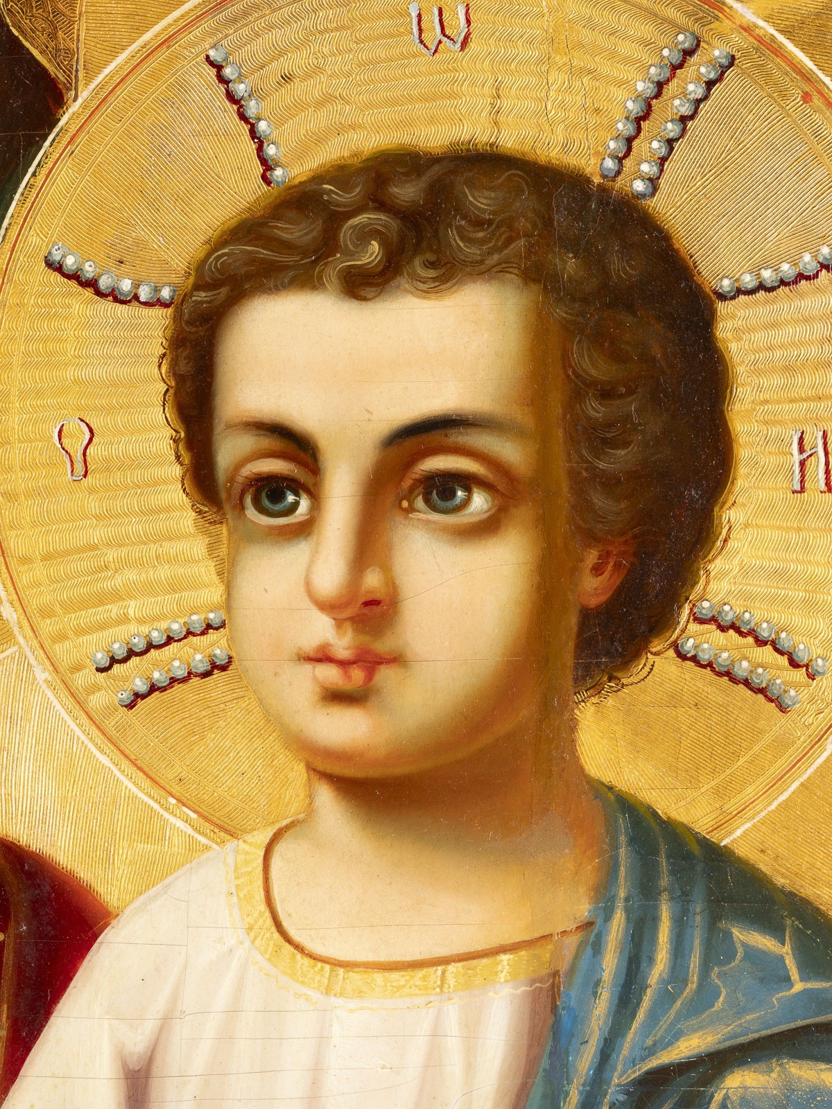Verbund dreier Laubholz-Bretter mit zwei Rückseiten-Sponki (verloren). Ölmalerei auf Lewkas, Goldgrund strahlenförmig graviert. 107,3 x 70,4 cm. Verso kyrillische Beschriftung mit Datierung, Ortsbezeichnung und Signatur. Vertikaler Riss min. rest., kleinere Retuschen.