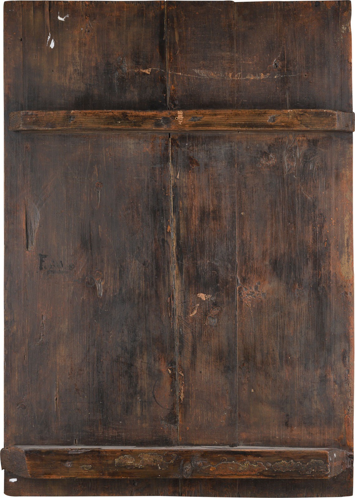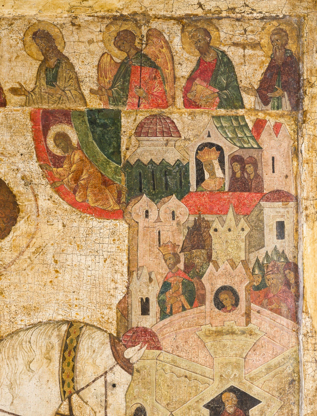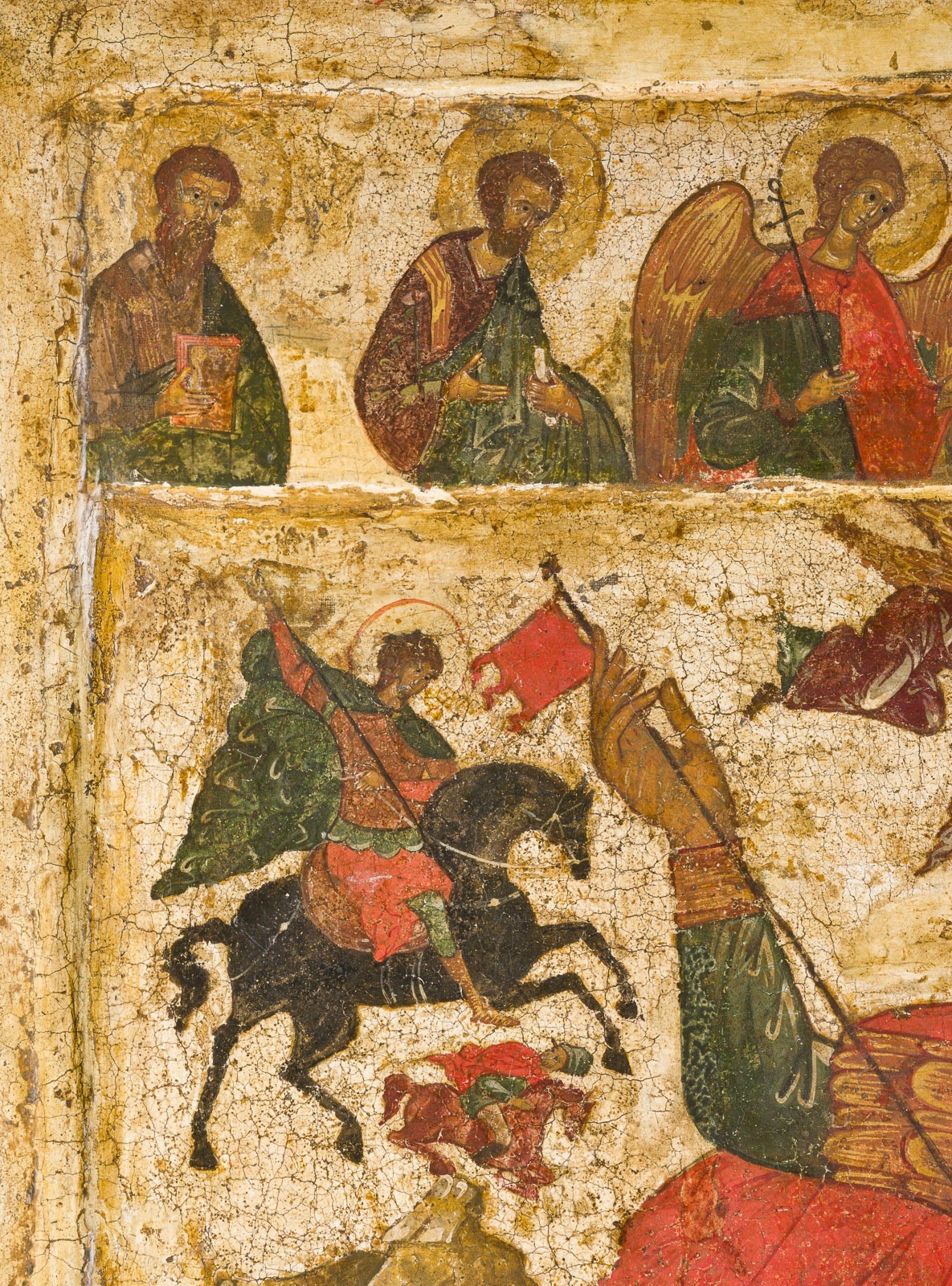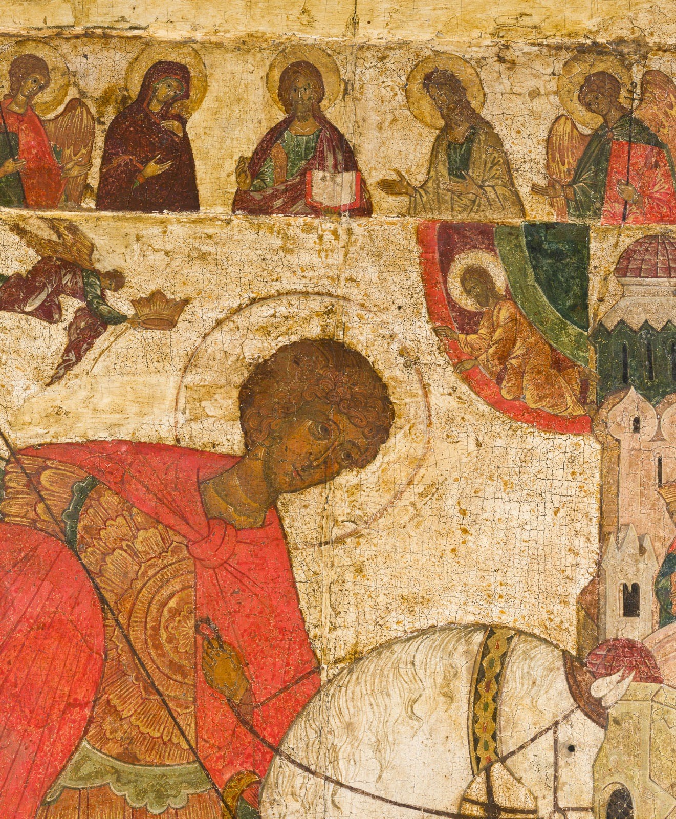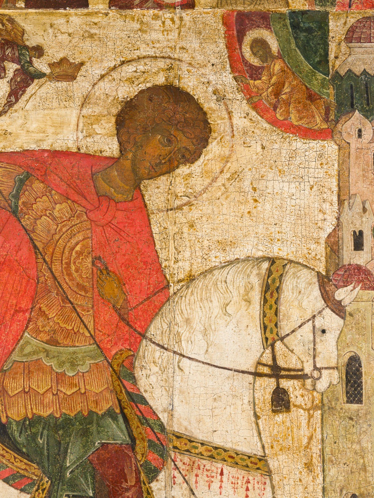Verbund mehrerer Bretter mit zwei Rückseiten-Sponki. Kowtscheg, Eitempera auf Kreidegrund, partielle Vergoldung. 119 x 84,3 cm. Der Heilige ist in voller Militärtracht dargestellt, ergänzt durch einen fliegenden roten Umhang, reitend auf einem kräftigen weißen Pferd. Der Sattel ist mit goldenen und