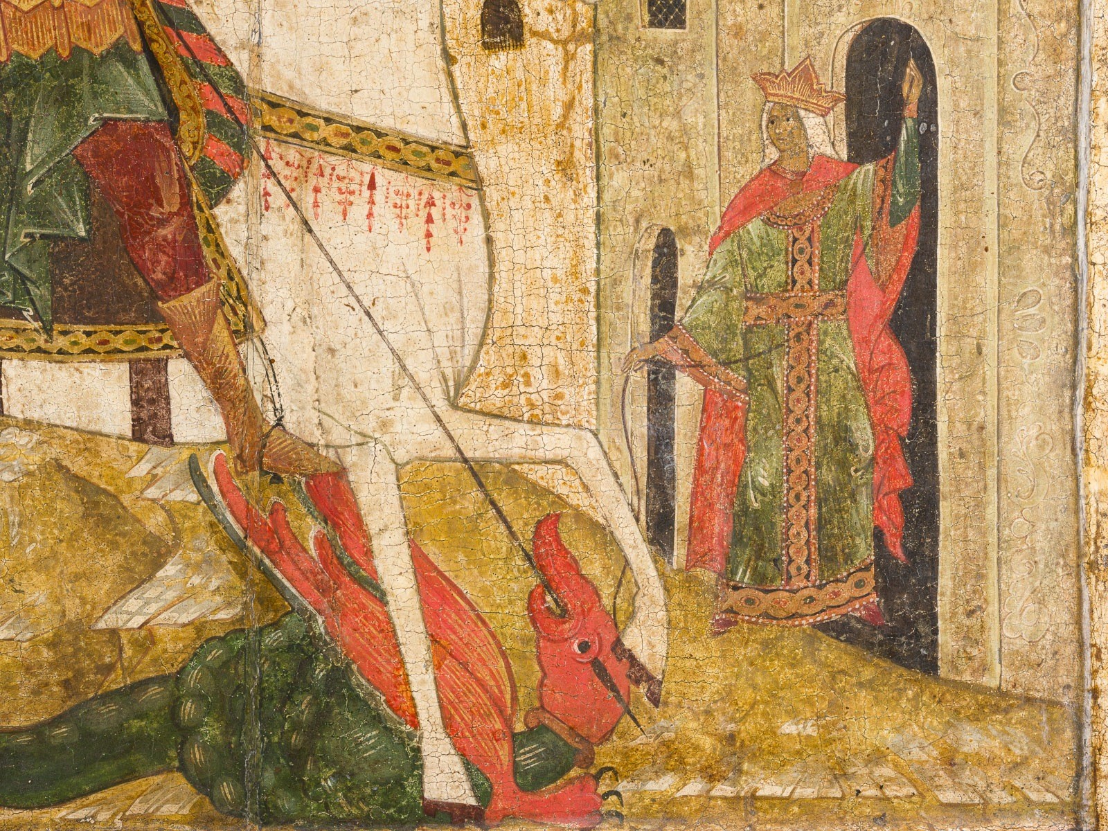 juwelenbesetzten Bändern verziert. Der Heilige Georg hält die Zügel seines Pferdes und
