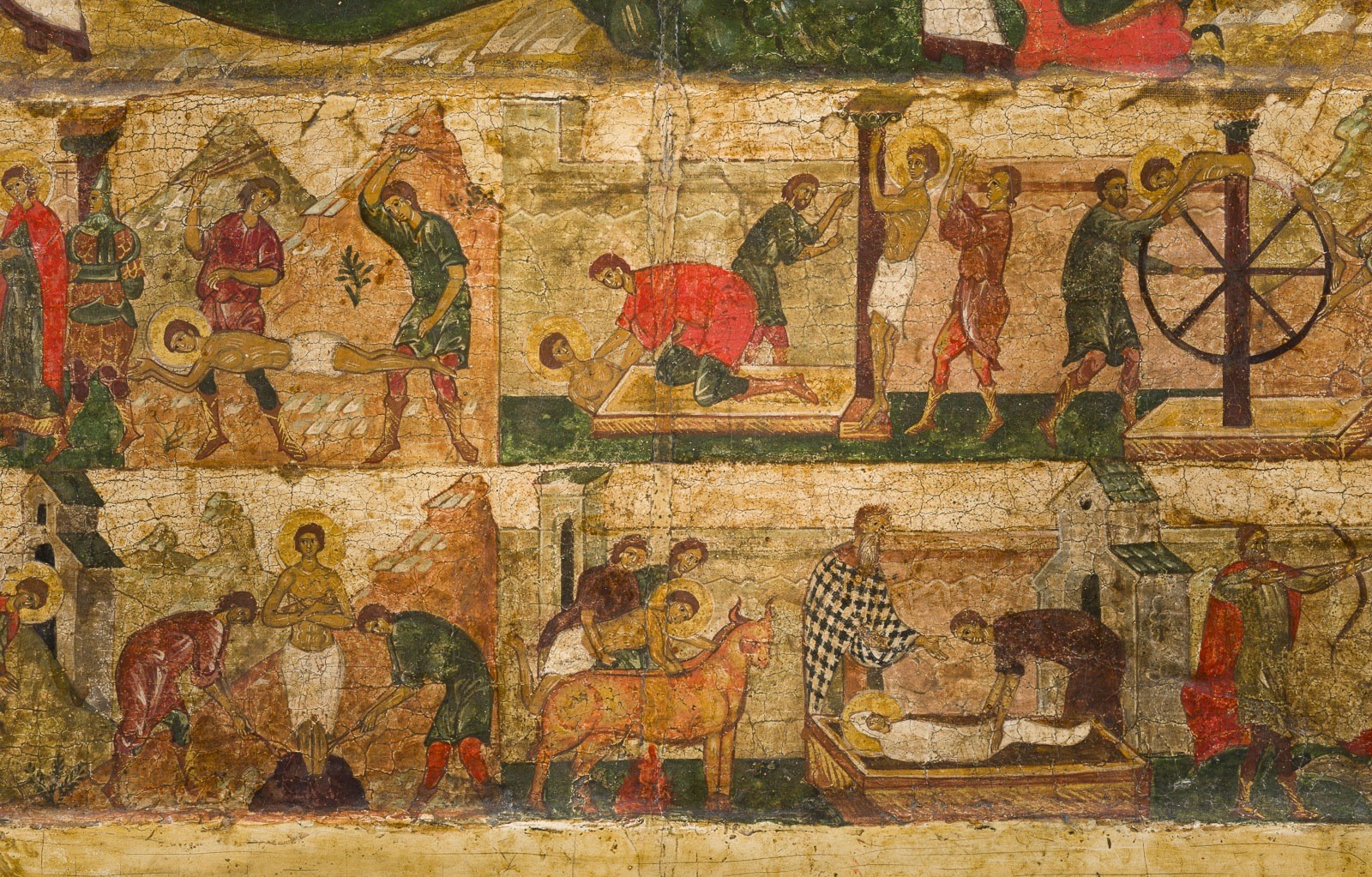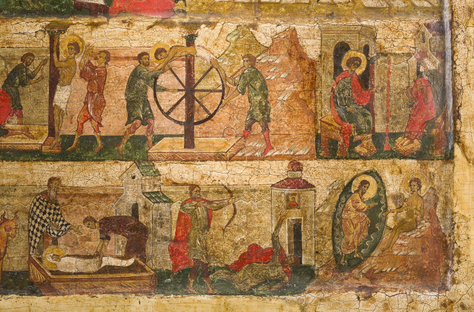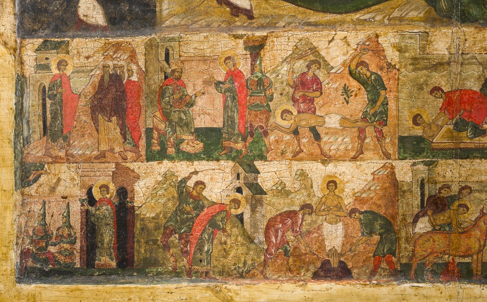 zeigt links eine karge, bergige Landschaft, im Gegensatz zu der dichten architektonischen Komposition auf der rechten Seite, die größtenteils in gedämpften Pastelltönen gehalten ist. Entlang des unteren Randes reihen sich 14 Bildfelder, die das Leben und Martyrium des Heiligen illustrieren. Am oberen Rand flankieren die Gottesmutter und Johannes der Vorläufer sowie weitere Heilige und Engel Christus.