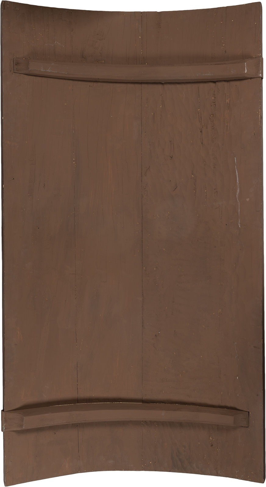 Verbund mehrerer Bretter mit zwei Rückseiten-Sponki. Kowtscheg, Eitempera auf Kreidegrund, Goldgrund mit vegetabilen Gravuren, Rand in Art der zeitgenössischen Email-Oklade dekoriert. 157,5 x 89 cm. Diese außergewöhnliche Ikone zeigt den Heiligen Nikolaus von Moschaisk, eine der
