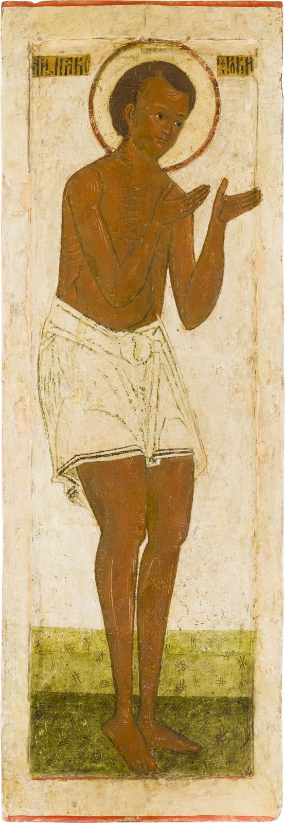 Einzeltafel mit zwei Rückseiten-Sponki. Kowtscheg, Lewkas, Eitempera. 104 x 36 cm. Farbe des Hintergrundes und Randes abgenommen, kleinere Retuschen.