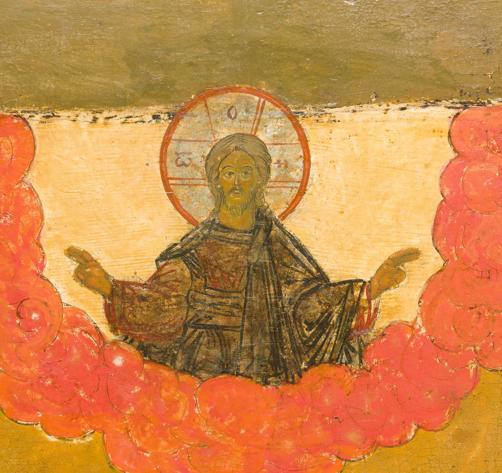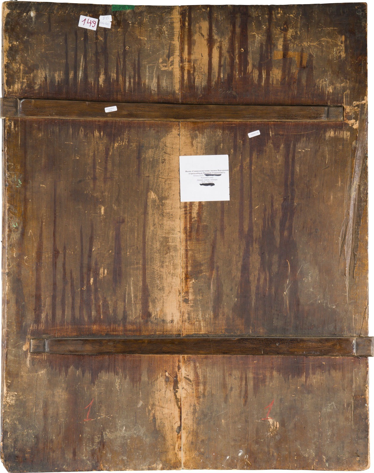 Verbund zweier Bretter mit zwei Rückseiten-Sponki (erg.). Kowtscheg, Lewkas, Eitempera, partielle Versilberung goldfarben lasiert. 99 x 78,4 cm. Vertikaler Riss rest., Retuschen.