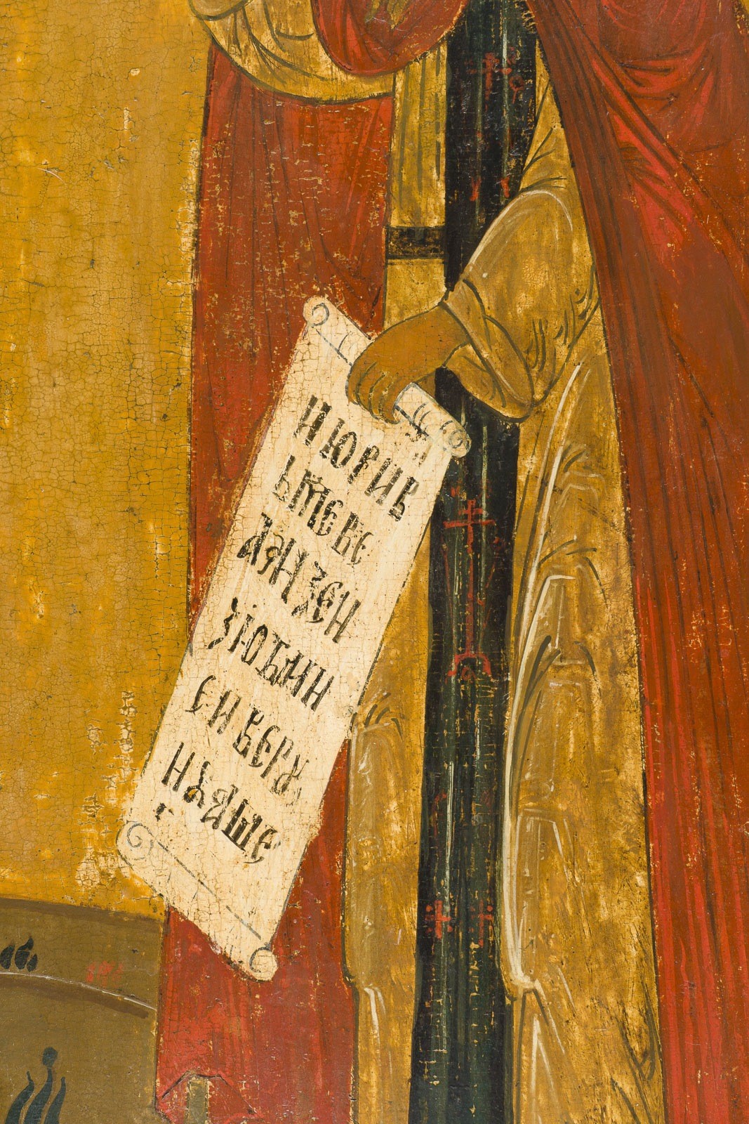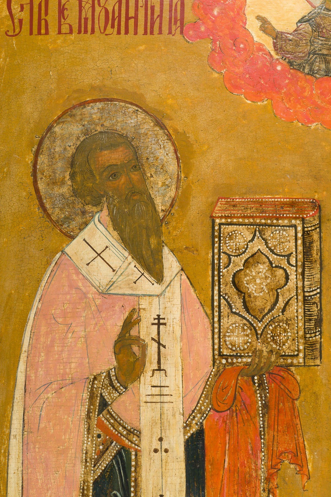 MONUMENTALE IKONE MIT DEN HEILIGEN ANTIPAS UND MAKARIJ VON ZELTYE VODY UND DER UNZA AUS EINER KIRCHEN-IKONOSTASE
