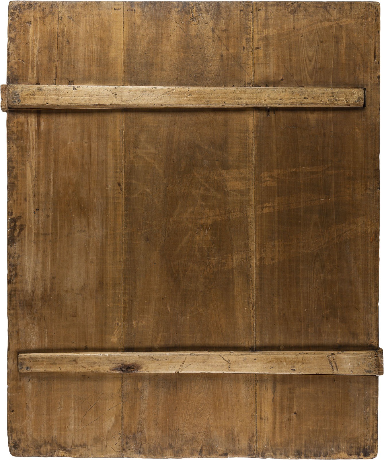 Verbund dreier Bretter mit zwei Rückseiten-Sponki. Kowtscheg, Eitempera auf Kreidegrund, Nimben und Hintergrund vergoldet. 106 x 86 cm. Sehr feine Ausführung der Malerei in kontrastierender Rot-Grün-Farbigkeit. Substanzverluste im unteren Bildfeld.