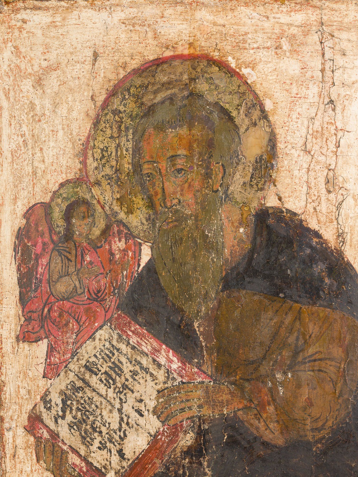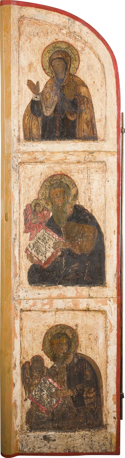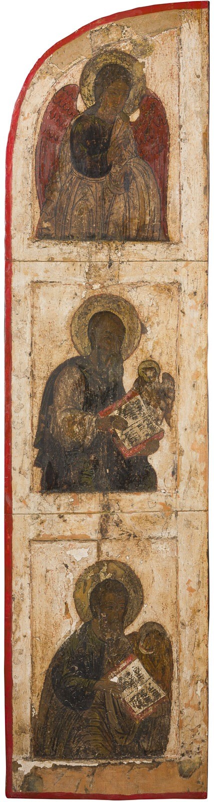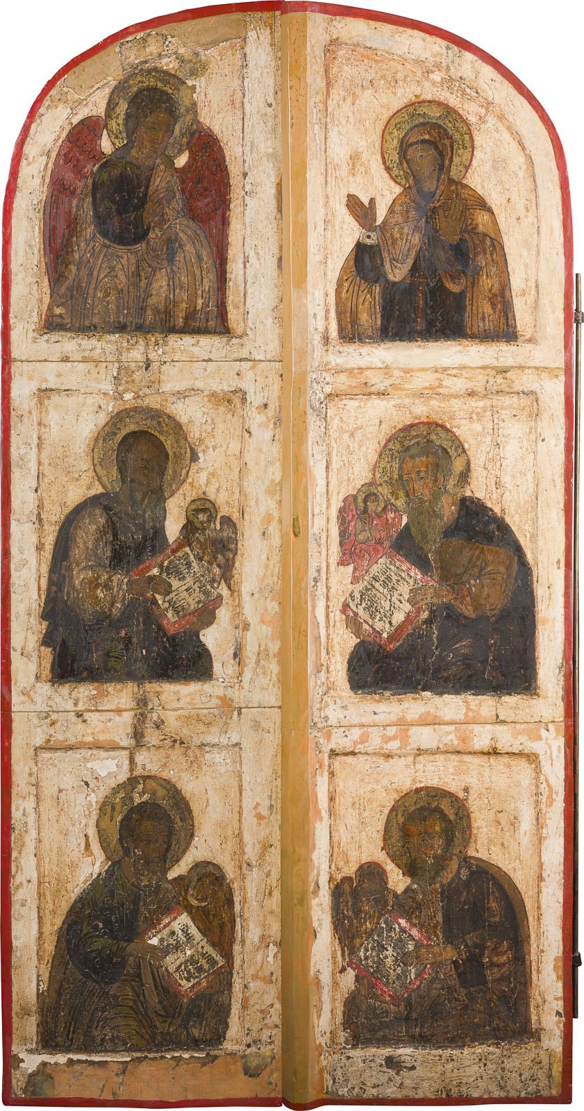 Verbund aus mehreren Holz-Brettern mit Rückseiten-Sponki. Kowtscheg, Lewkas, Eitempera. Jeweils 176 x 46 cm. In den oberen zwei Bildfeldern ist die Szene der Verkündigung wiedergegeben. Halbfigurige