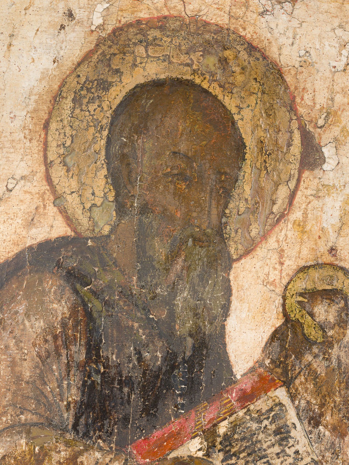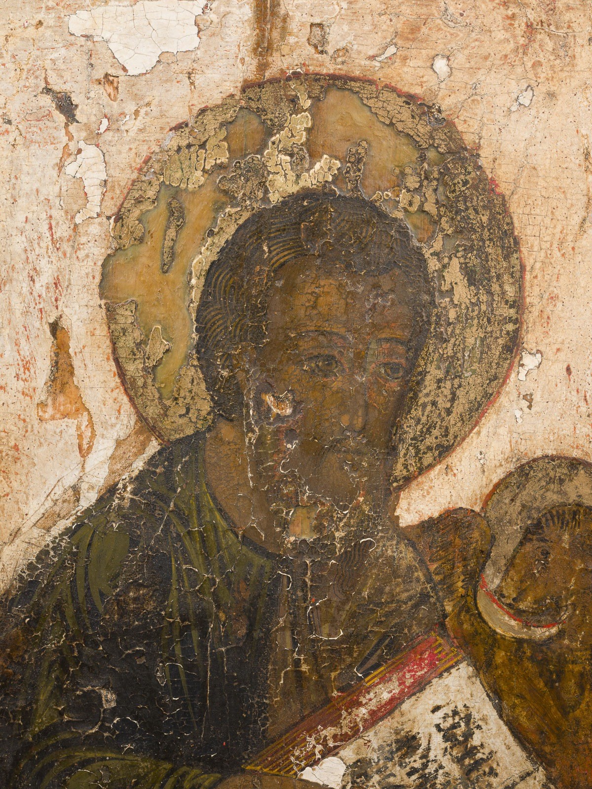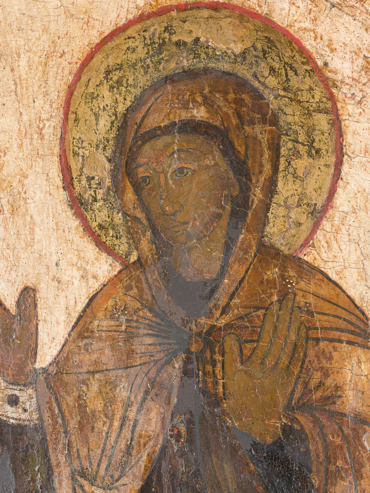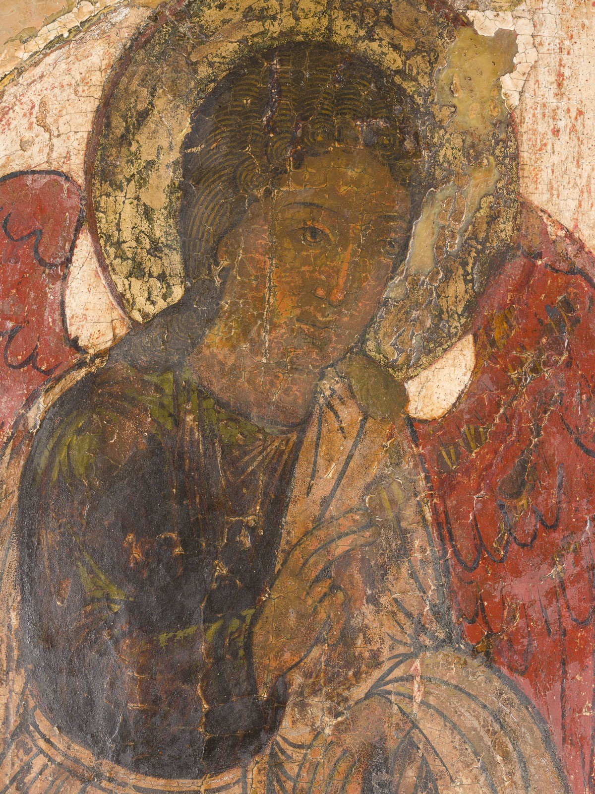 Verbund aus mehreren Holz-Brettern mit Rückseiten-Sponki. Kowtscheg, Lewkas, Eitempera. Jeweils 176 x 46 cm. In den oberen zwei Bildfeldern ist die Szene der Verkündigung wiedergegeben. Halbfigurige