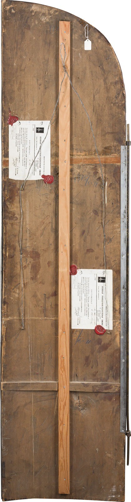 präsentierend, in Begleitung ihrer Symboltiere. Partiell stark rest., Übermalungen, jeweils in drei Platten zerschnitten und wieder zusammengefügt, rückseitig mit Leisten verstärkt.