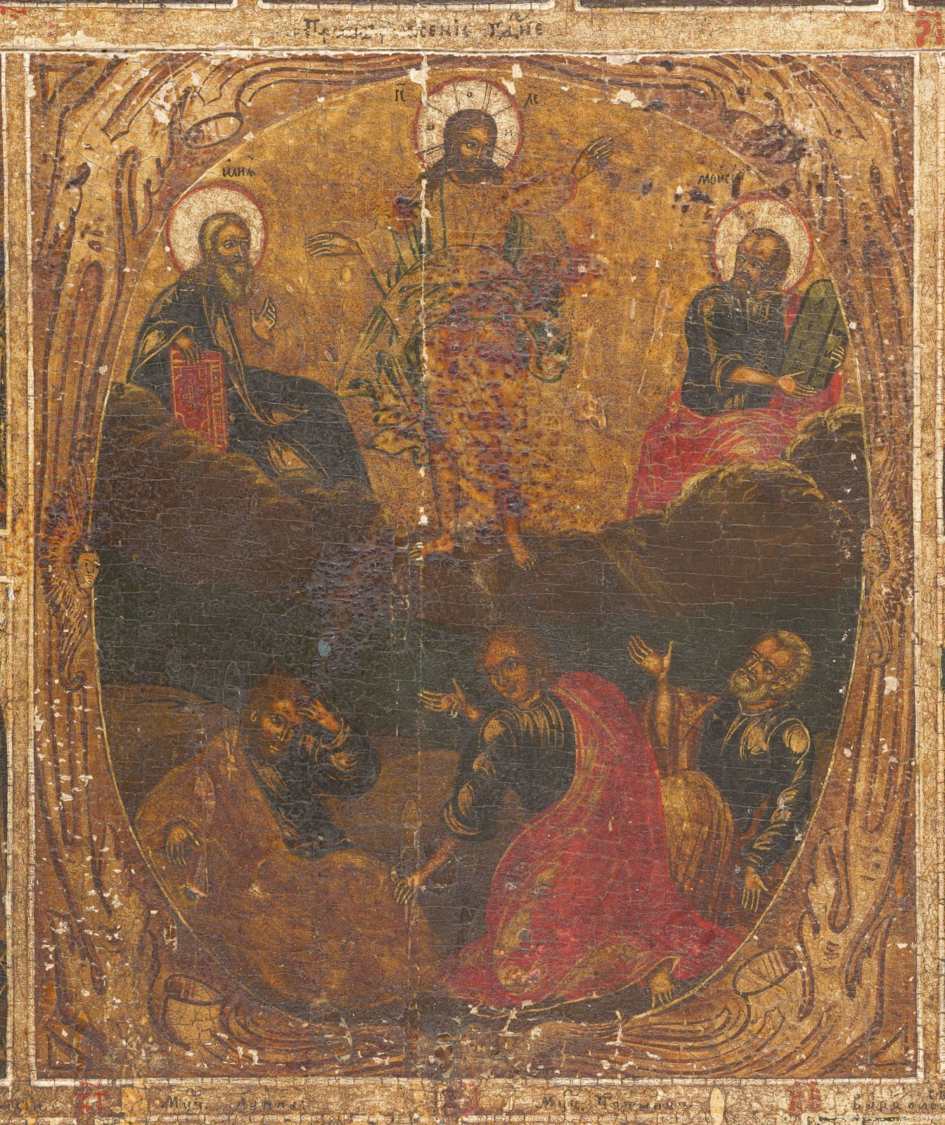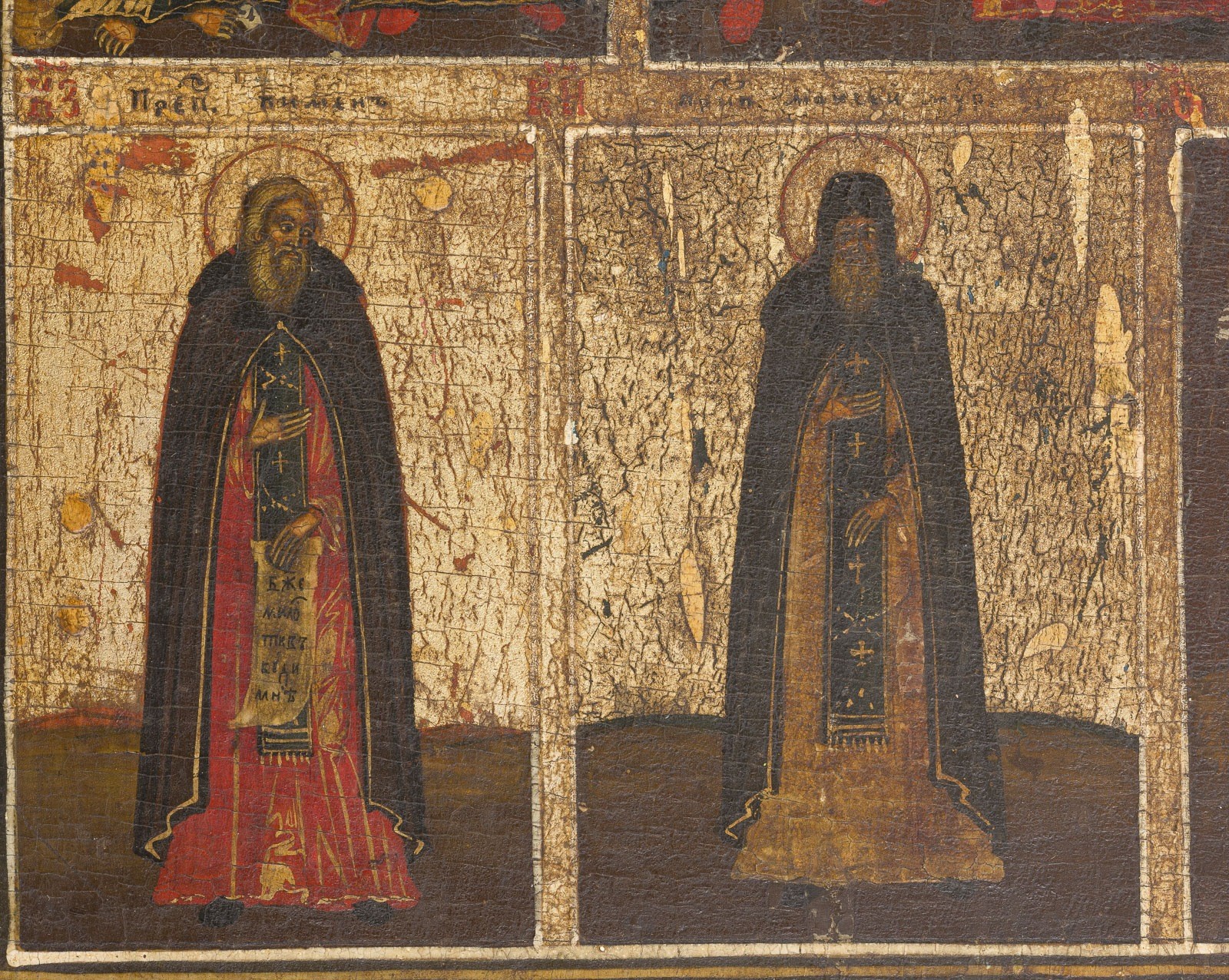Verbund zweier Bretter mit zwei profilierten Rückseiten-Sponki. Eitempera auf Kreidegrund, Hintergrund vergoldet. 74,1 x 54 cm. Horizontaler Schnitt rest., Kanten min. best.