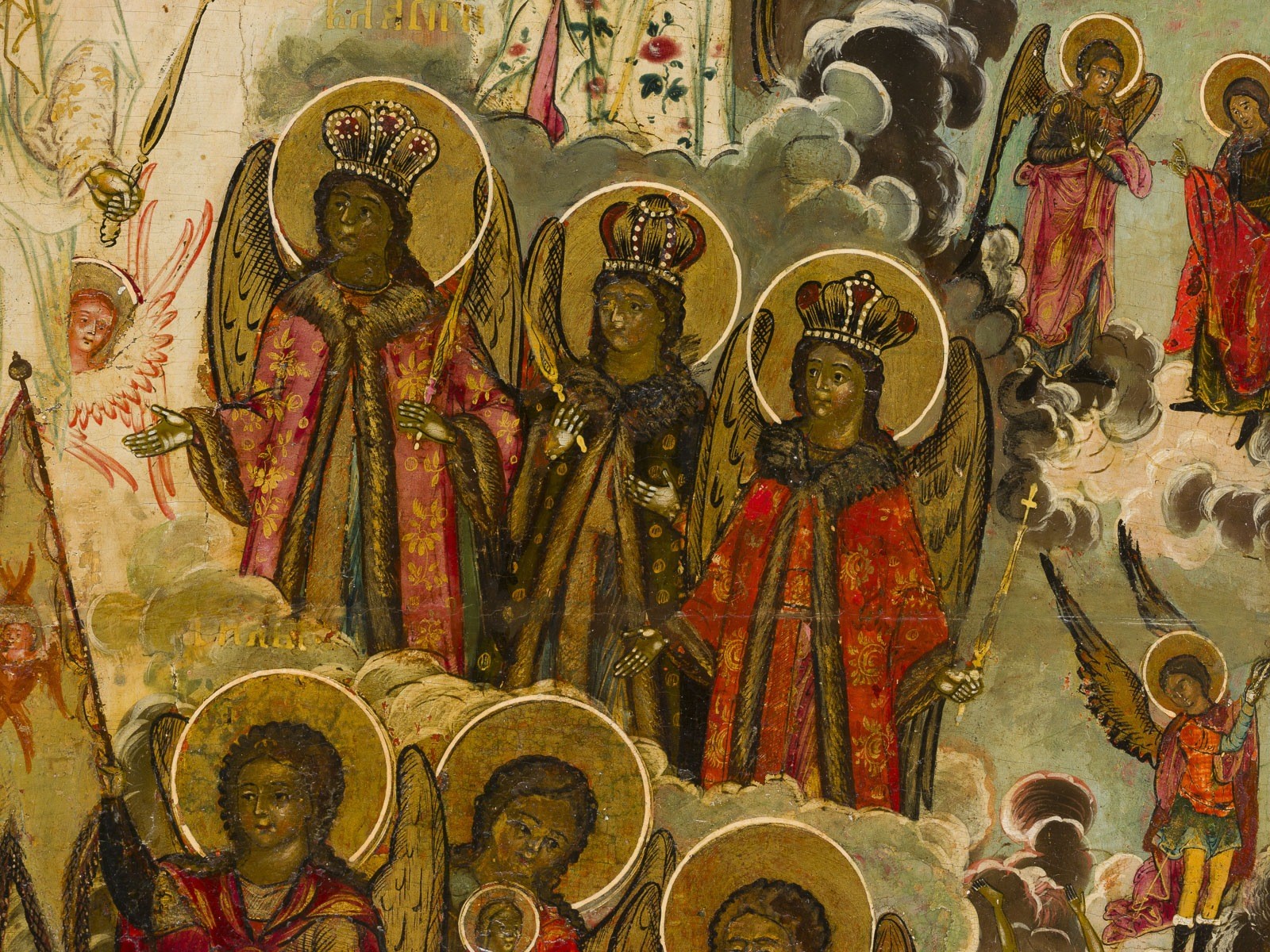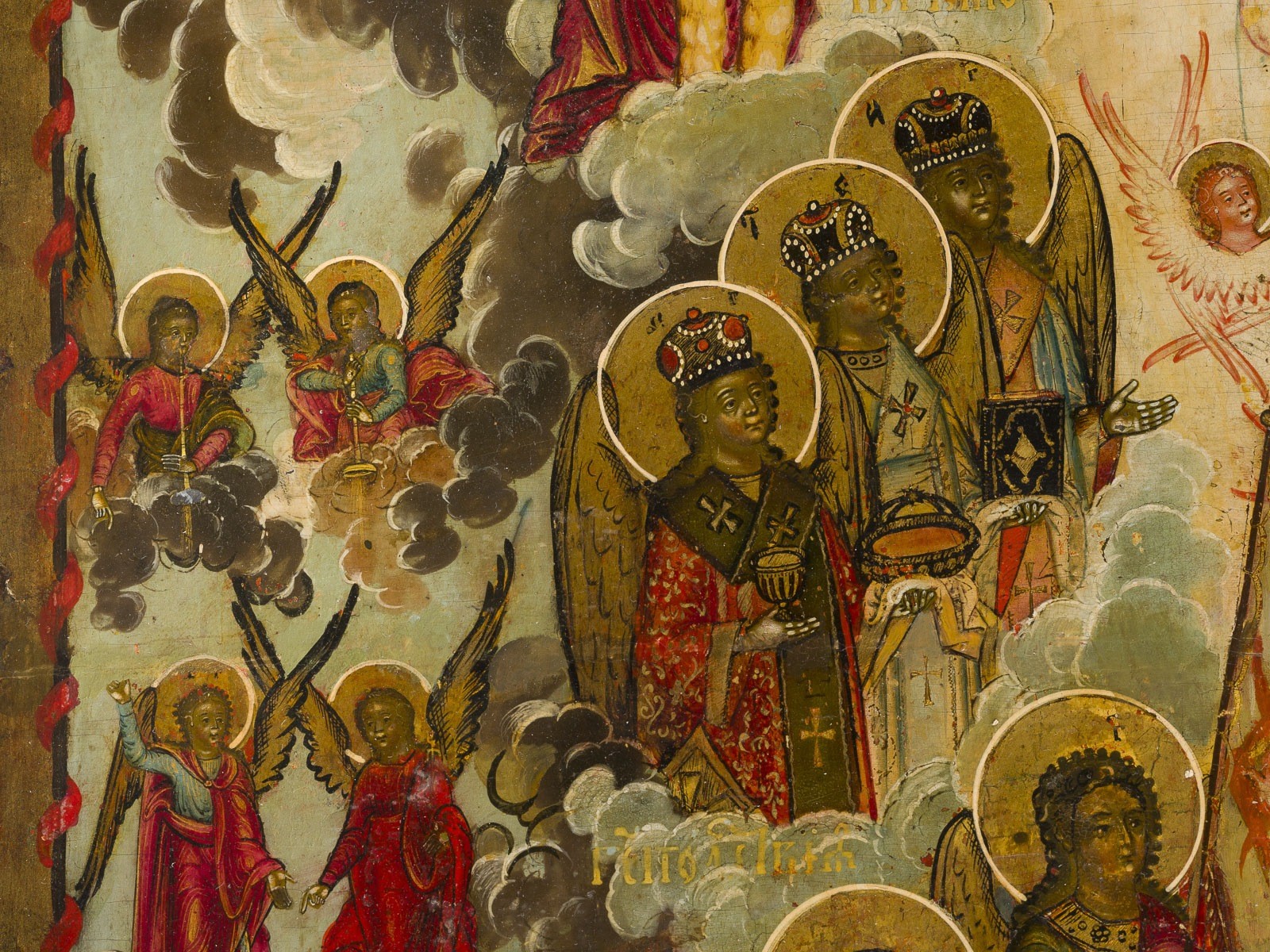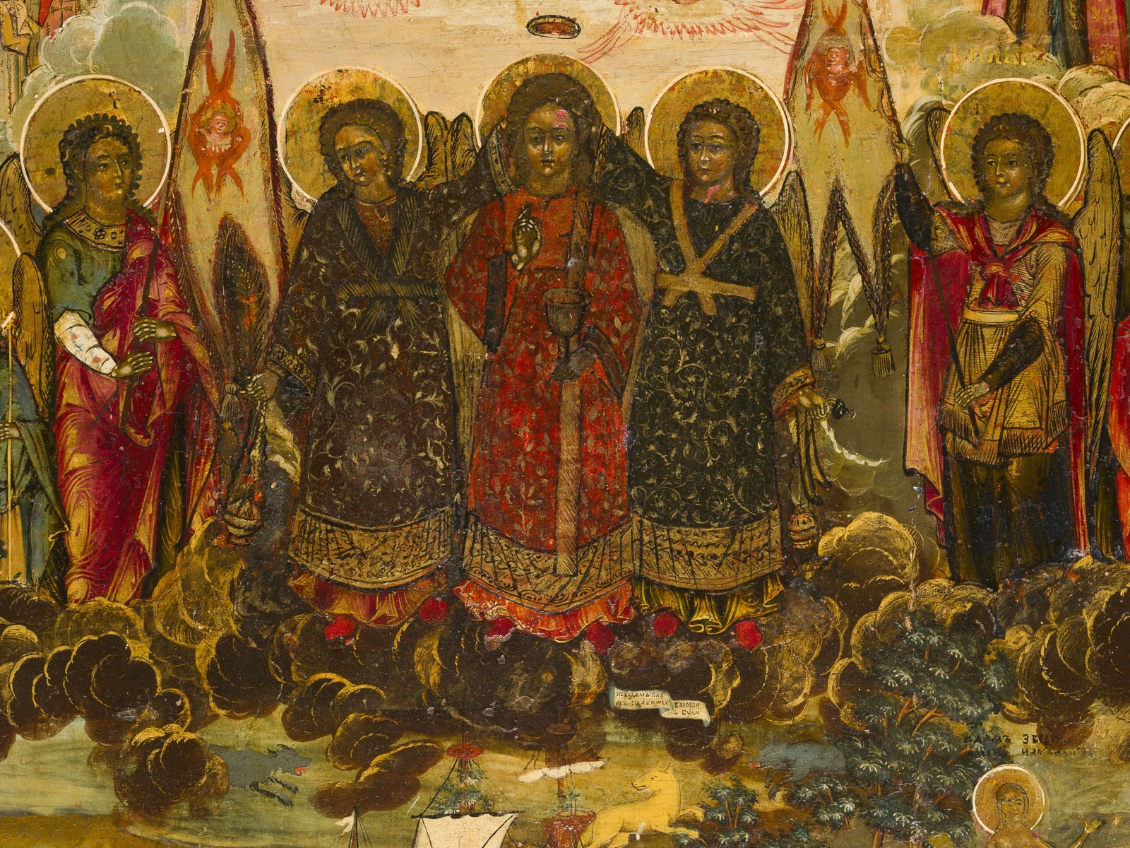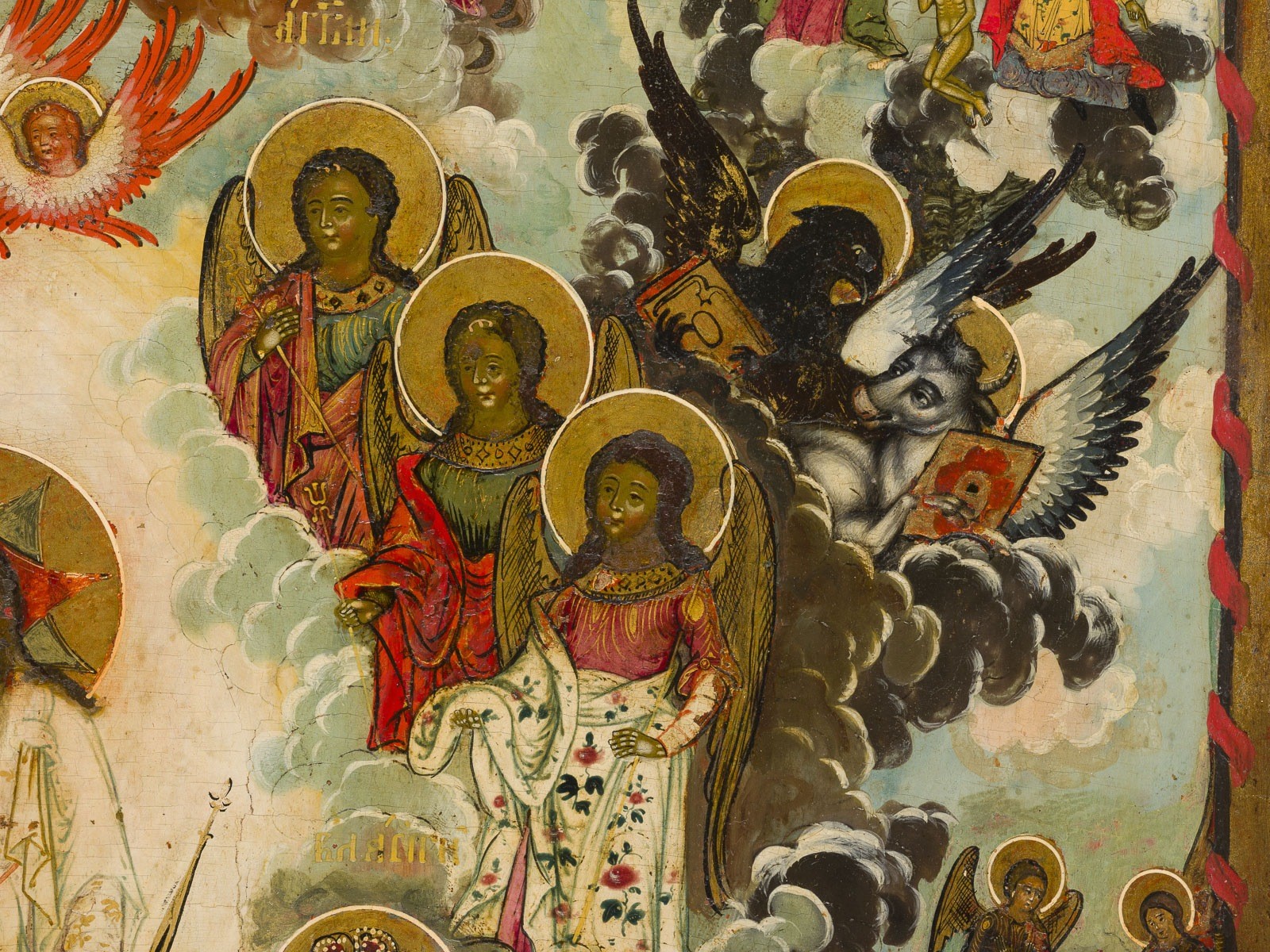 MONUMENTALE, SELTENE UND SEHR FEINE IKONE MIT DER NEUTESTAMENTLICHEN DREIFALTIGKEIT UND DEN ERZENGELN