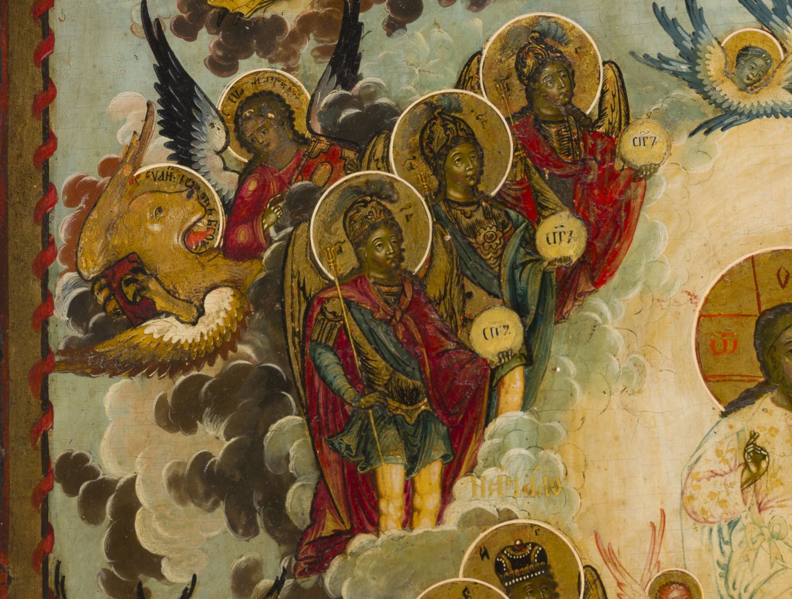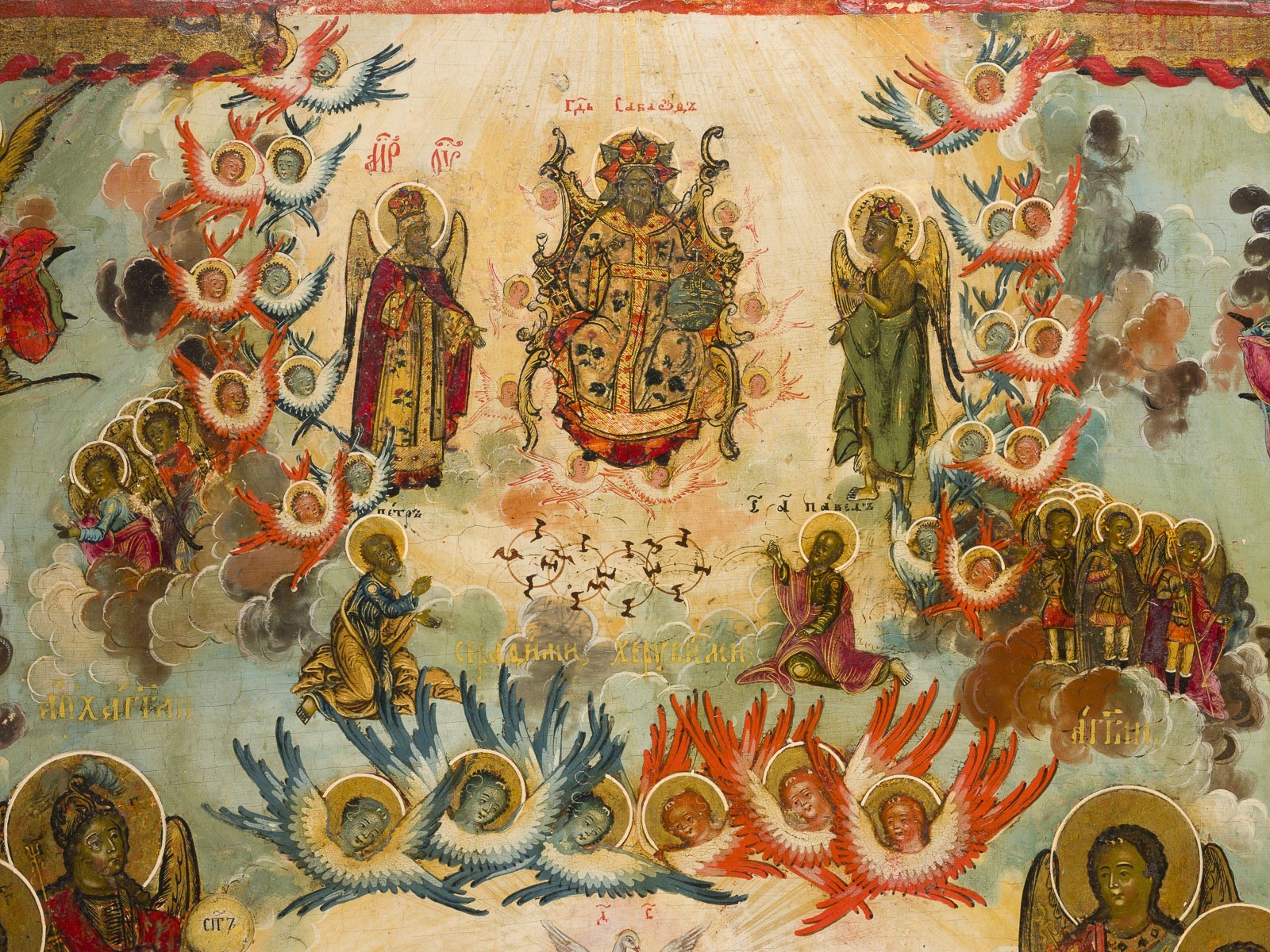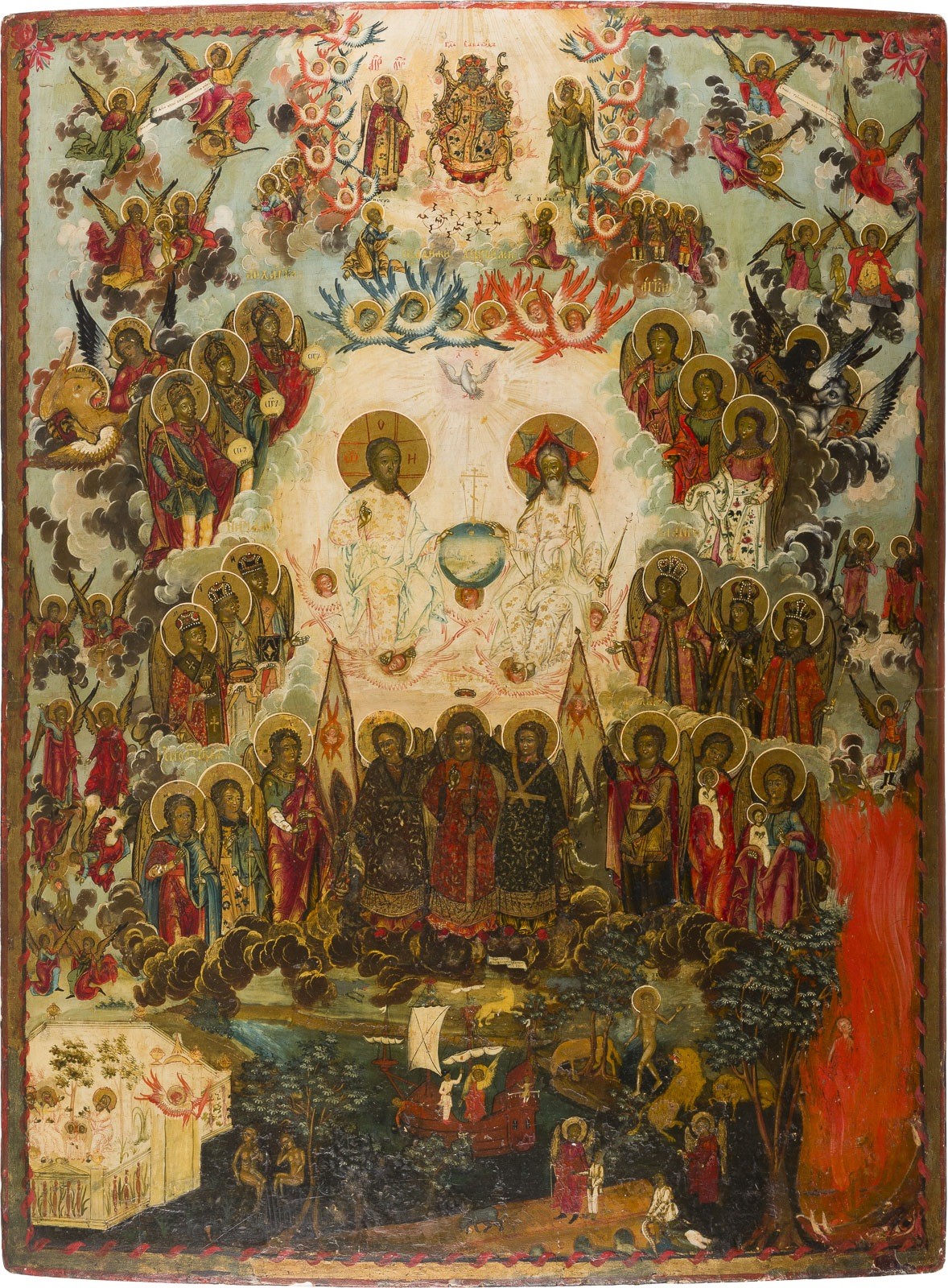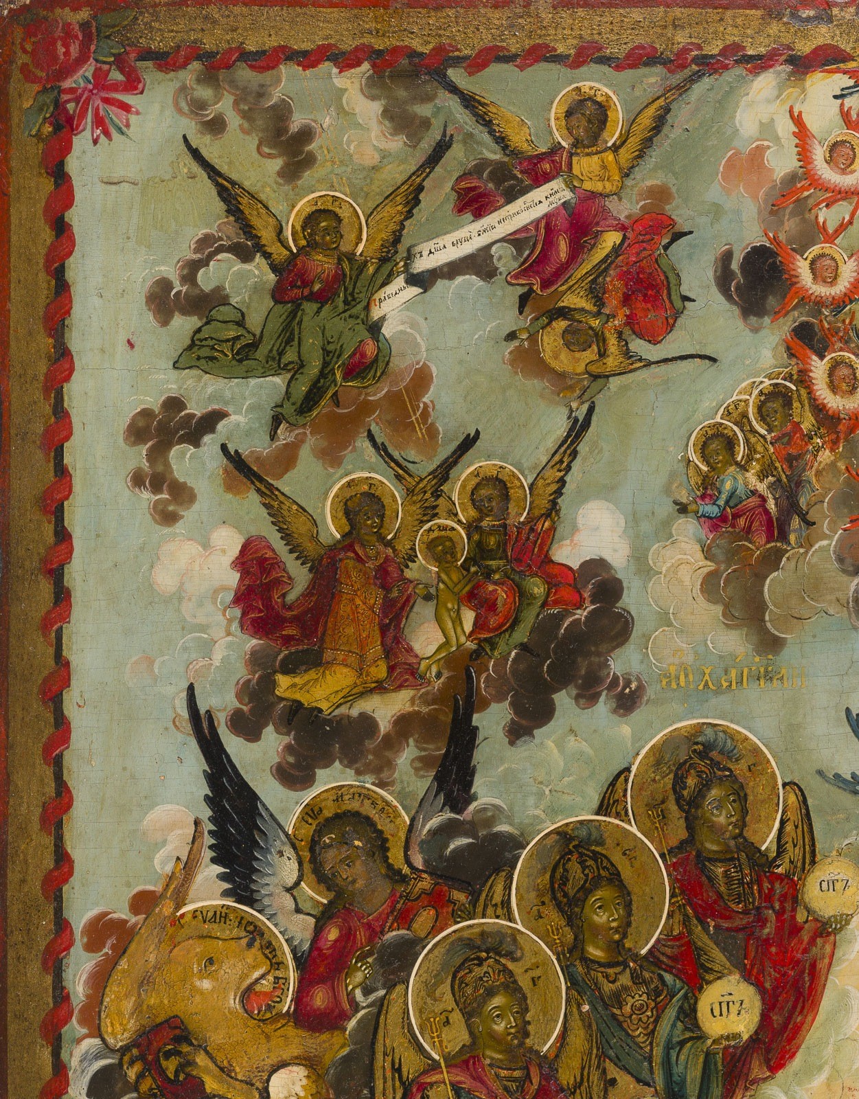 MONUMENTALE, SELTENE UND SEHR FEINE IKONE MIT DER NEUTESTAMENTLICHEN DREIFALTIGKEIT UND DEN ERZENGELN