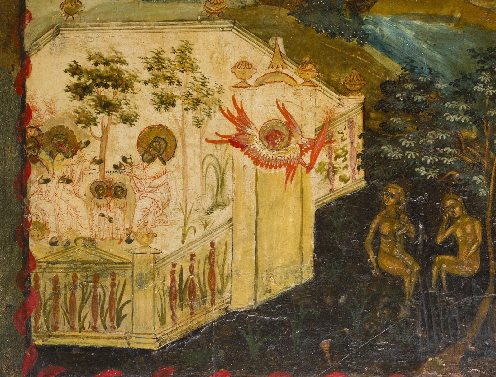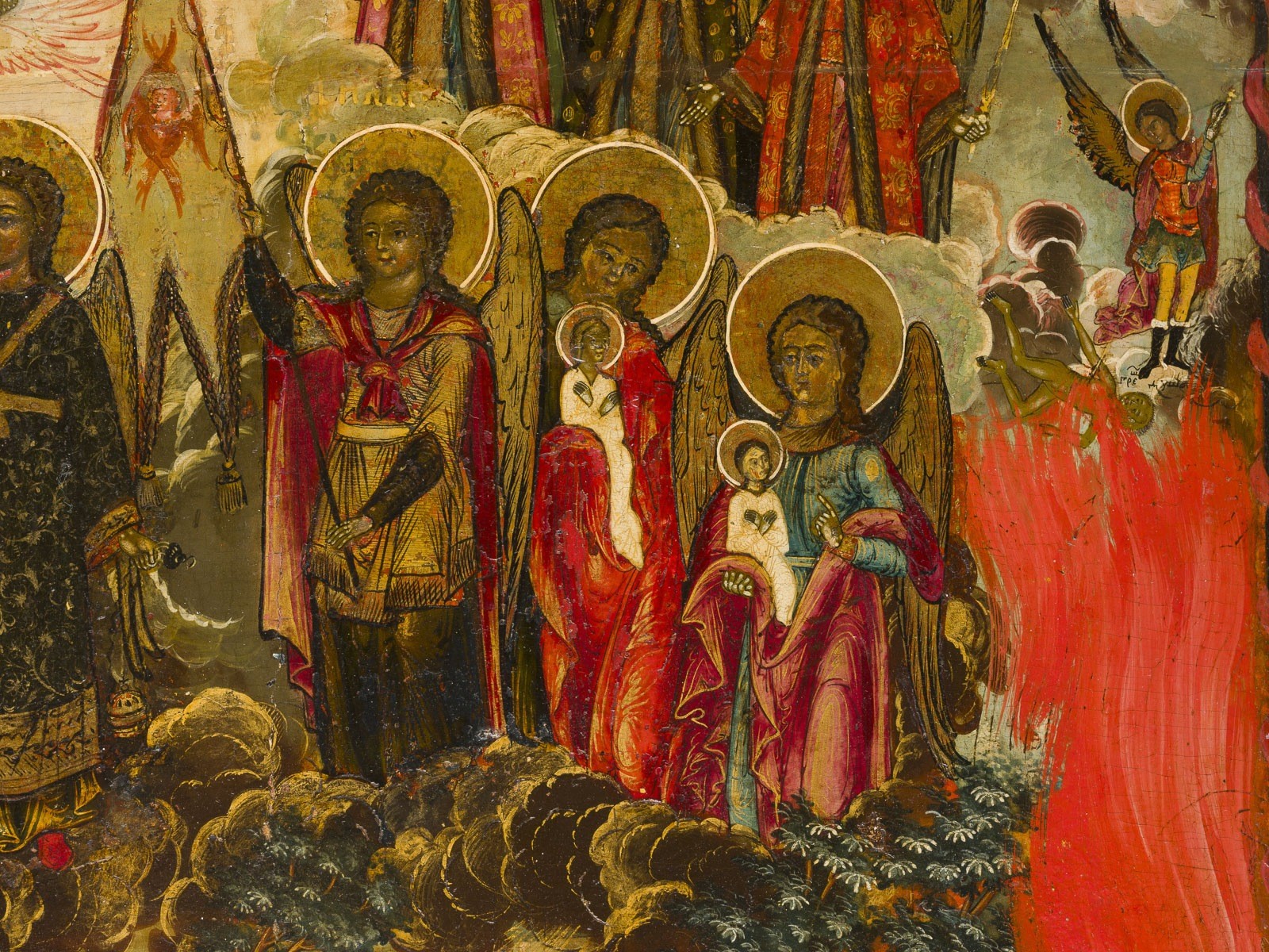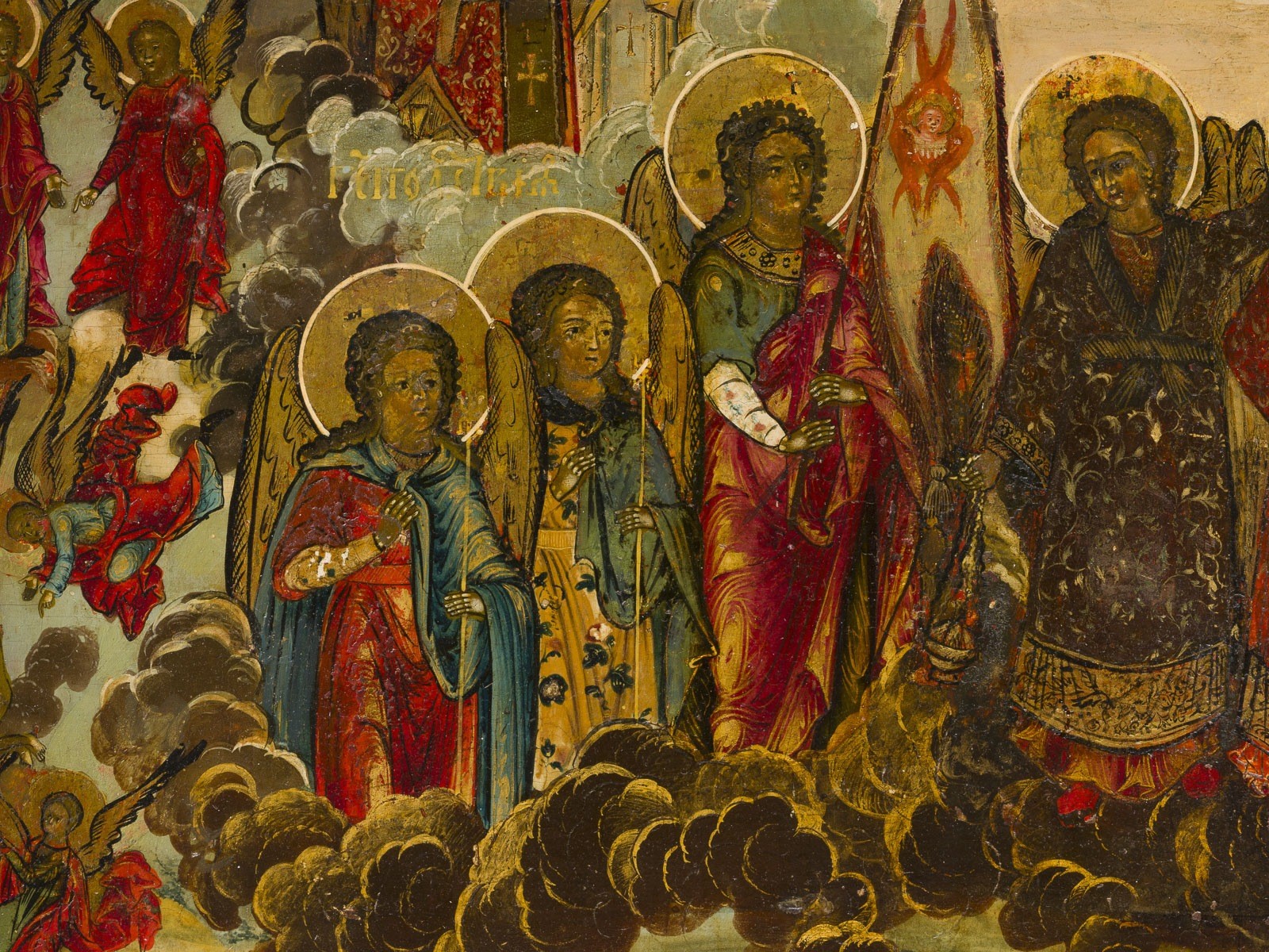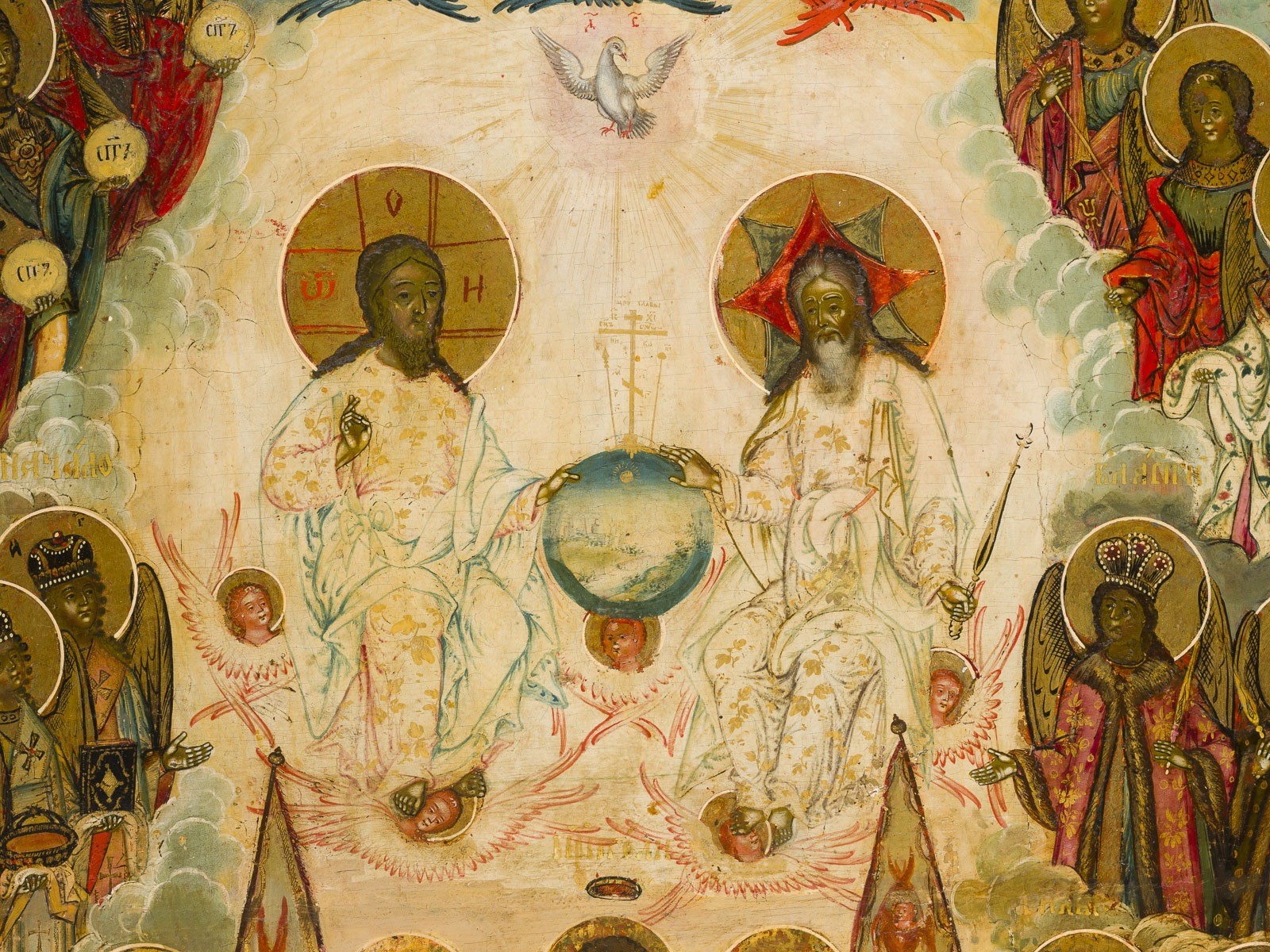 MONUMENTALE, SELTENE UND SEHR FEINE IKONE MIT DER NEUTESTAMENTLICHEN DREIFALTIGKEIT UND DEN ERZENGELN