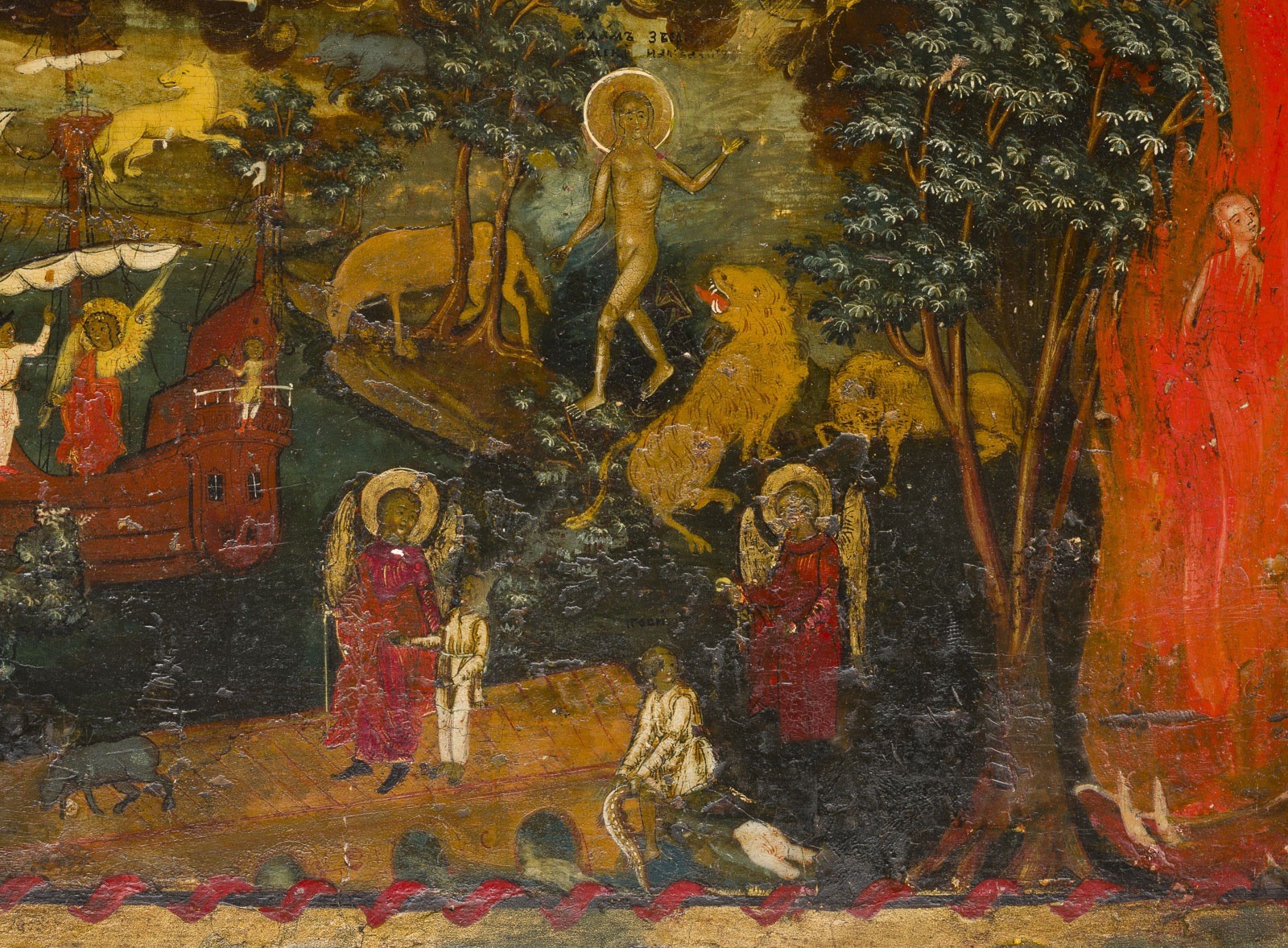 Eitempera auf Kreidegrund auf Holz, auf Holztafel aufgedoppelt. Nimben und Rand vergoldet. 75 x 57.2 cm. Äußerst detailreiche und vielszenige Darstellung in hoher Qualität mit zahlreichen
