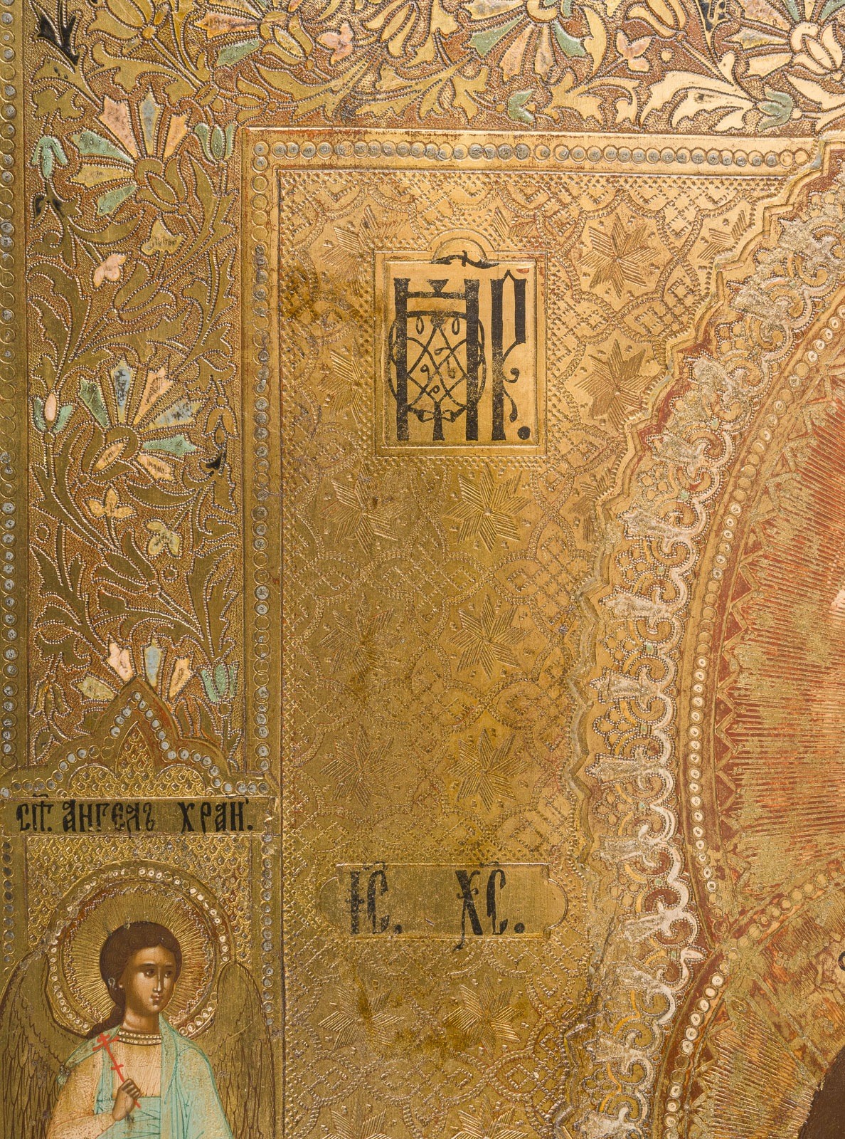Verbund zweier Bretter mit zwei Rückseiten-Sponki. Eitempera auf Kreidegrund, reiche Chrysographie, Goldgrund ornamental punziert, der Rand in Art der zeitgenössischen Cloisonné-Email-Oklade dekoriert. 71 x 56,2 cm. Vier Randheilige: Schutzengel und die Heiligen Paraskewa, Basilius dem Grossen und